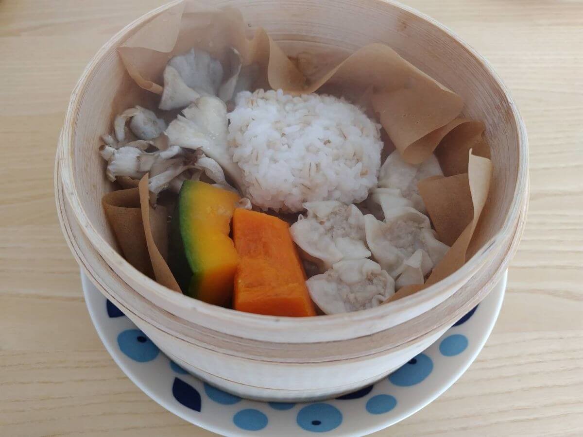 今回は、冷凍ご飯・生のかぼちゃ・まいたけ・チルドのしゅうまいを入れて蒸していきます。電子レンジから何度も出し入れする必要がないので、時間も手間も省けますよ。