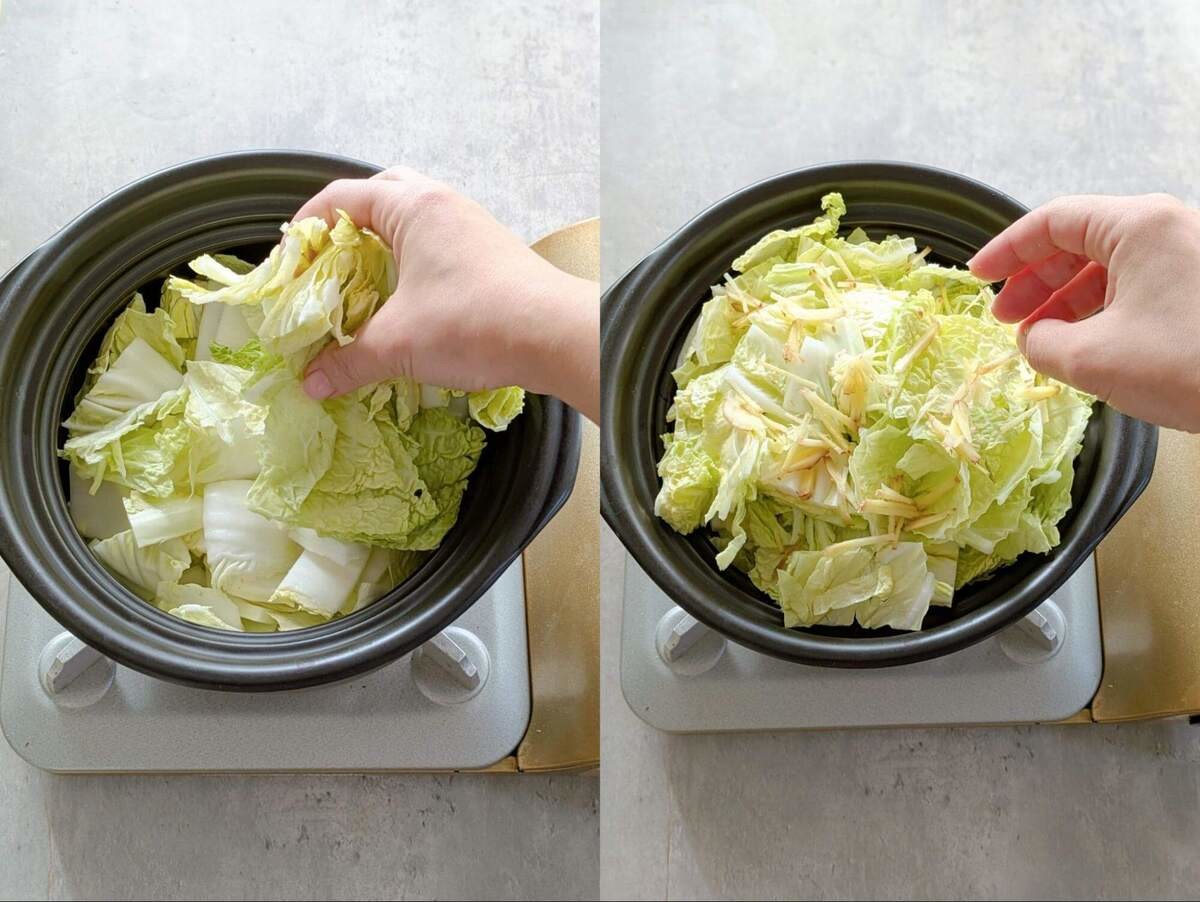 鍋に白菜の茎を入れてその上に葉をのせ、生姜の半量を散らします。