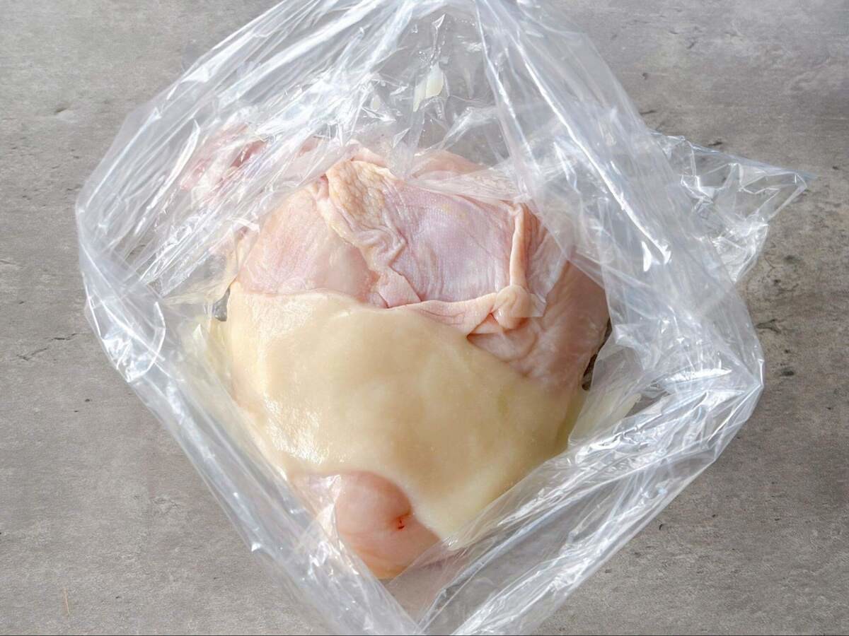 鶏むね肉はフォークで全体に穴をあけ、塩麹をまぶして30分から一晩置きます。ビニール袋に入れてもみ込んで冷蔵庫に入れておきました。