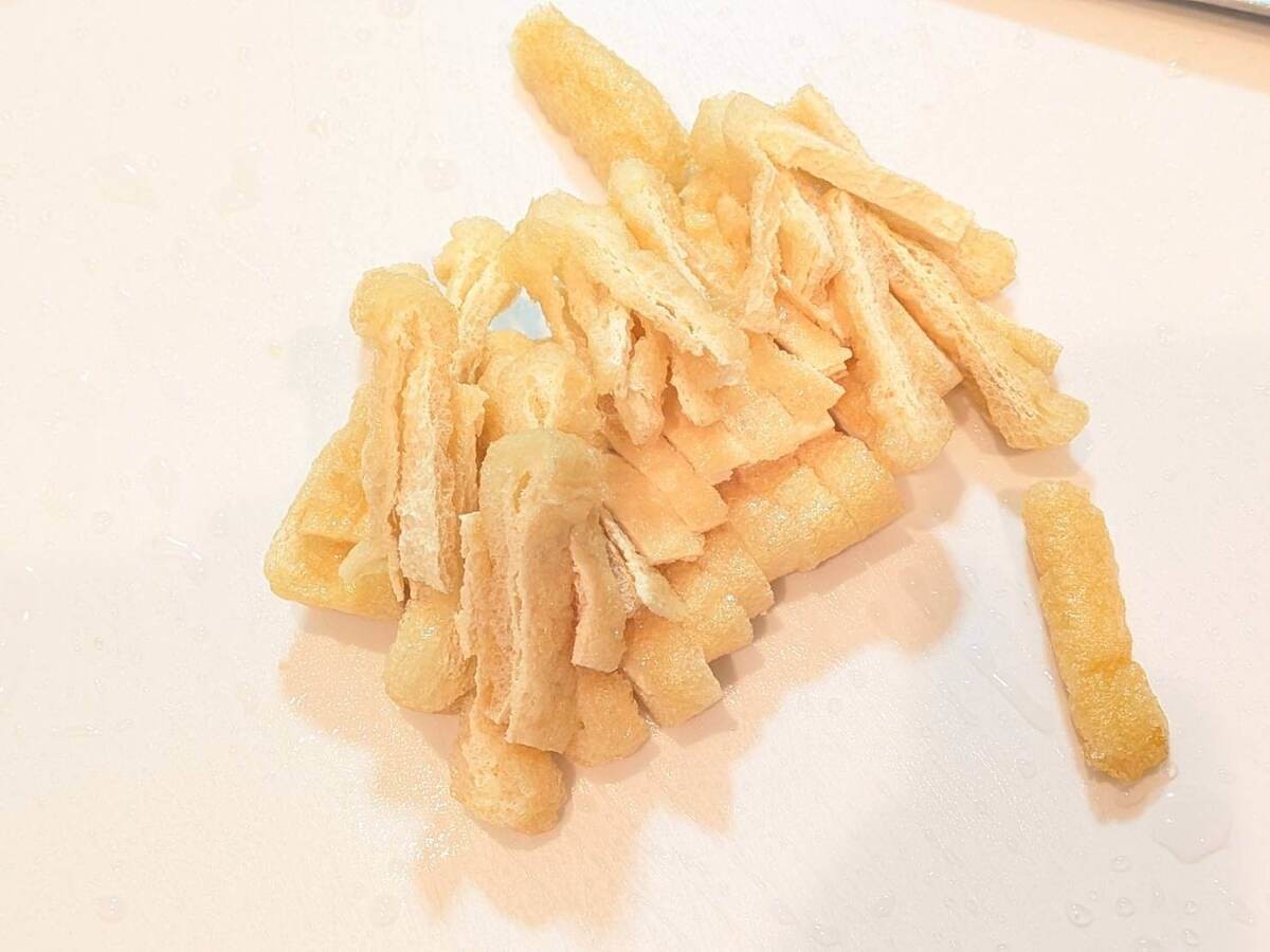 油揚げは薄切りにします。今回は横に切ってから揃えて5mm幅に切りました。