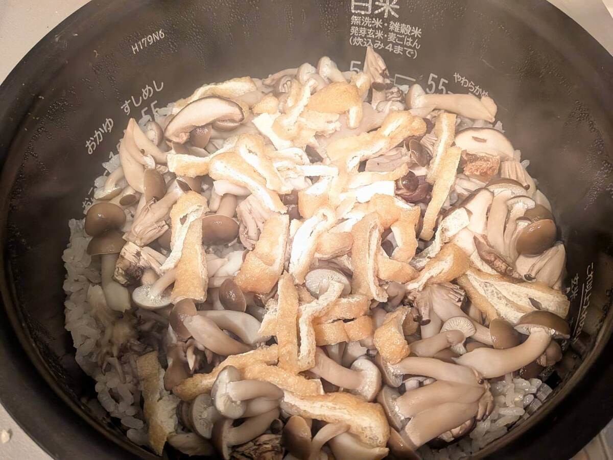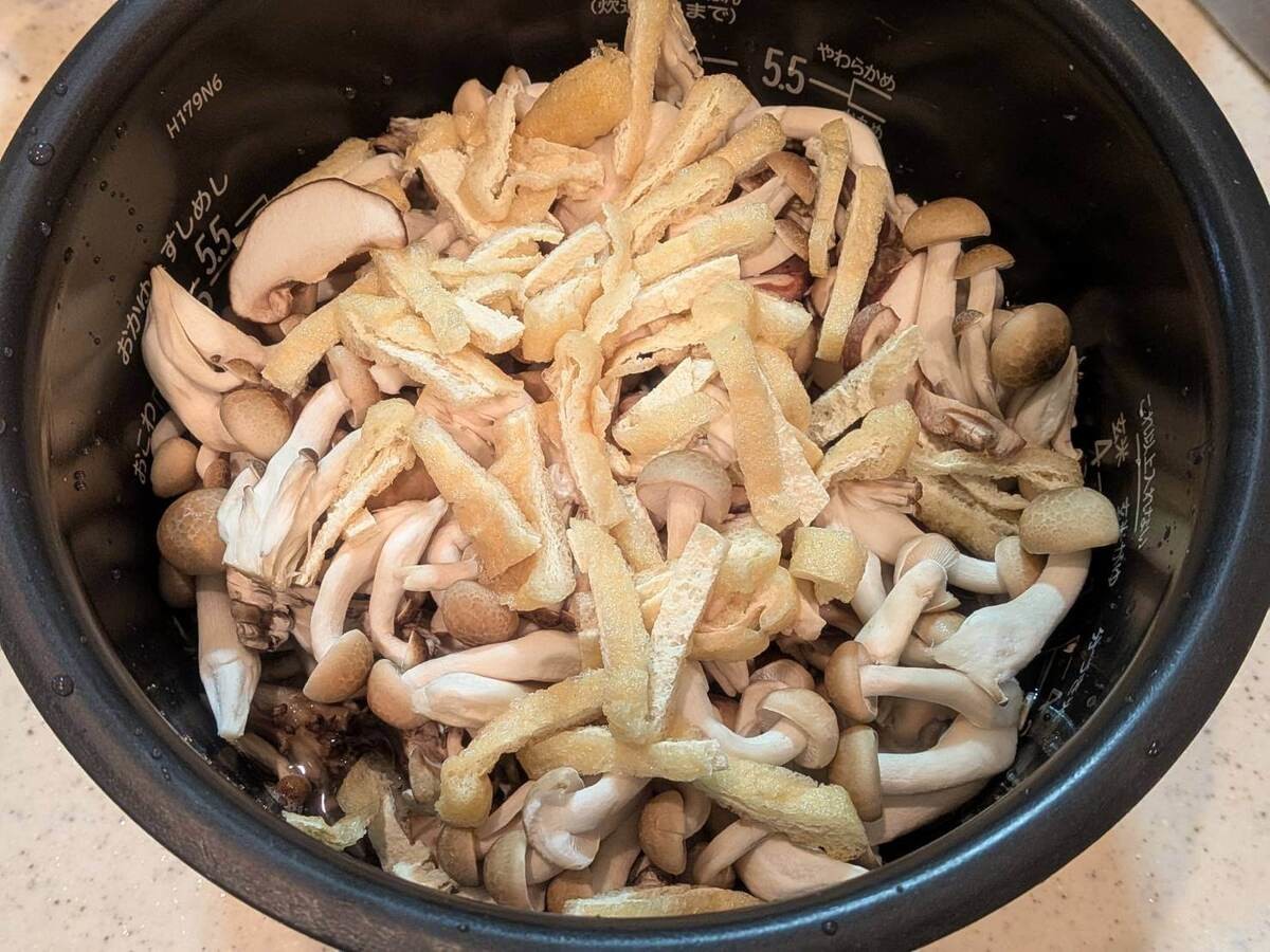 今回はきのこの炊き込みごはんですが、にんじんやごぼうなど、冷蔵庫にあるお野菜や具材を入れても良さそう!