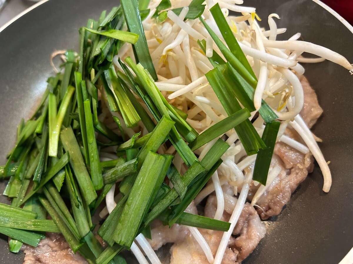 ニラともやしを加えて、ここからは強火でサッと炒め合わせましょう。豚肉から出た脂を全体にまとわせるのがポイントです。
