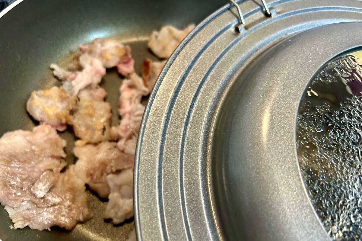 豚肉の表面にじんわりと脂の汗が出てきたら、頃合いです!