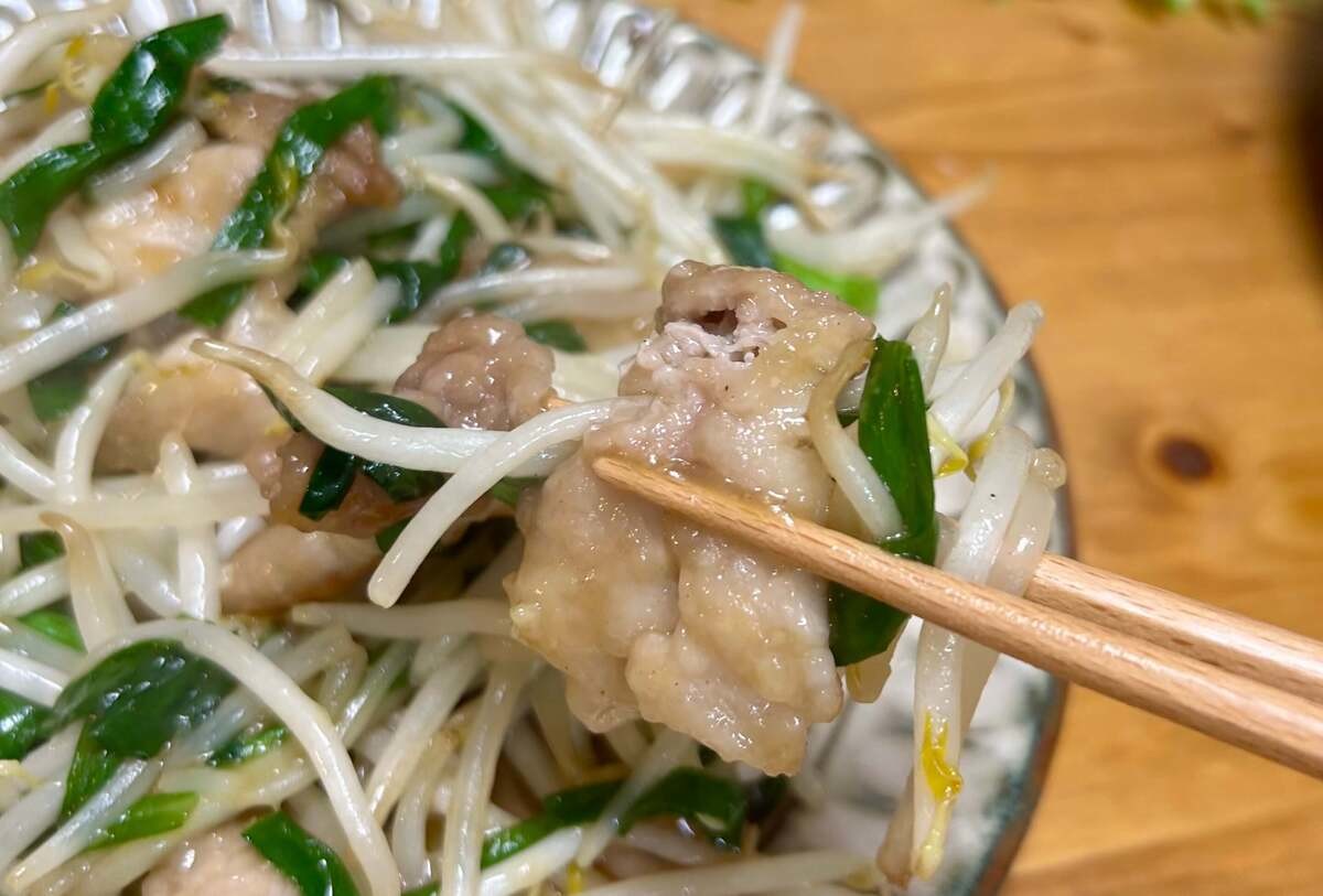 もやしはシャキシャキ、豚肉は片栗粉をまぶした効果で旨みがギュッと閉じ込められていて、焼けている部分は香ばしく、驚くほどジューシーな仕上がり。