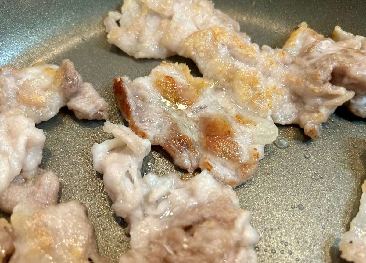 油をひかずに豚肉をフライパンにキレイに並べたら、強めの中火で加熱スタート!片面に焼き色をつけていきましょう。