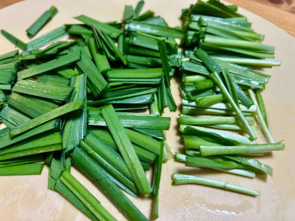 ニラは4cmのざく切りにしておきます。切ってみるとなかなかのボリュームですね……。