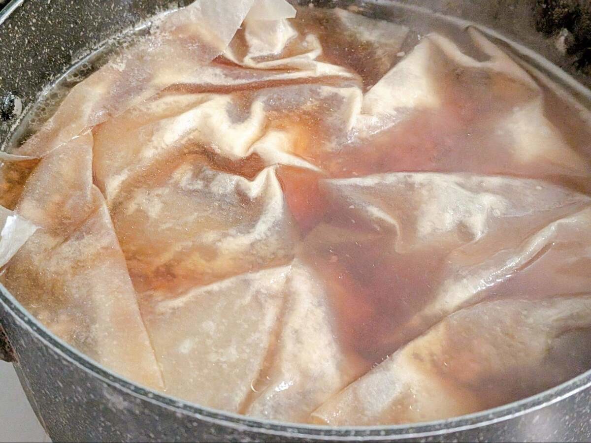 アクを取ったら、真ん中に穴を開けたキッチンペーパーを落とし蓋にし、弱〜中火で20分ほど煮ます。
