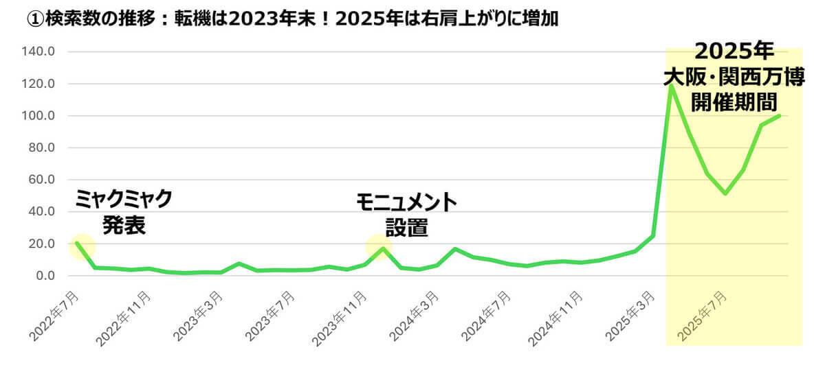 その結果、出生地や設定など「ミャクミャクってどんなキャラなの?」という知識を求める動きが強まったと見られます。