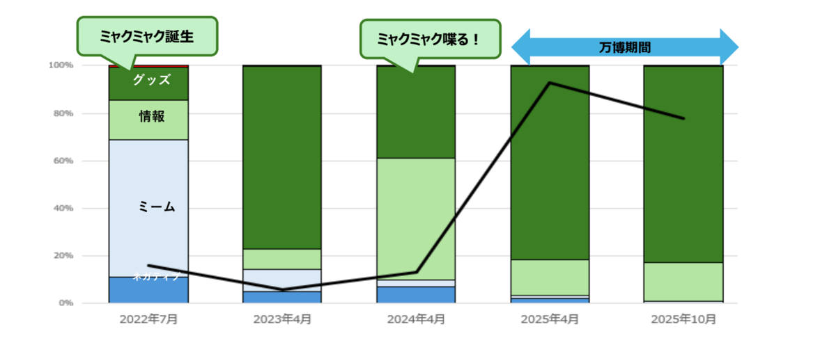 分析では、「ネガティブ(気持ち悪い・怖いなど)」「ミーム(ネタ・妖怪など)」「情報(由来・プロフィールなど)」「グッズ(商品・コラボなど)」「ポジティブ(かわいい・会いたいなど)」の5分類に分け、それぞれの構成比を時期ごとに比較しました。