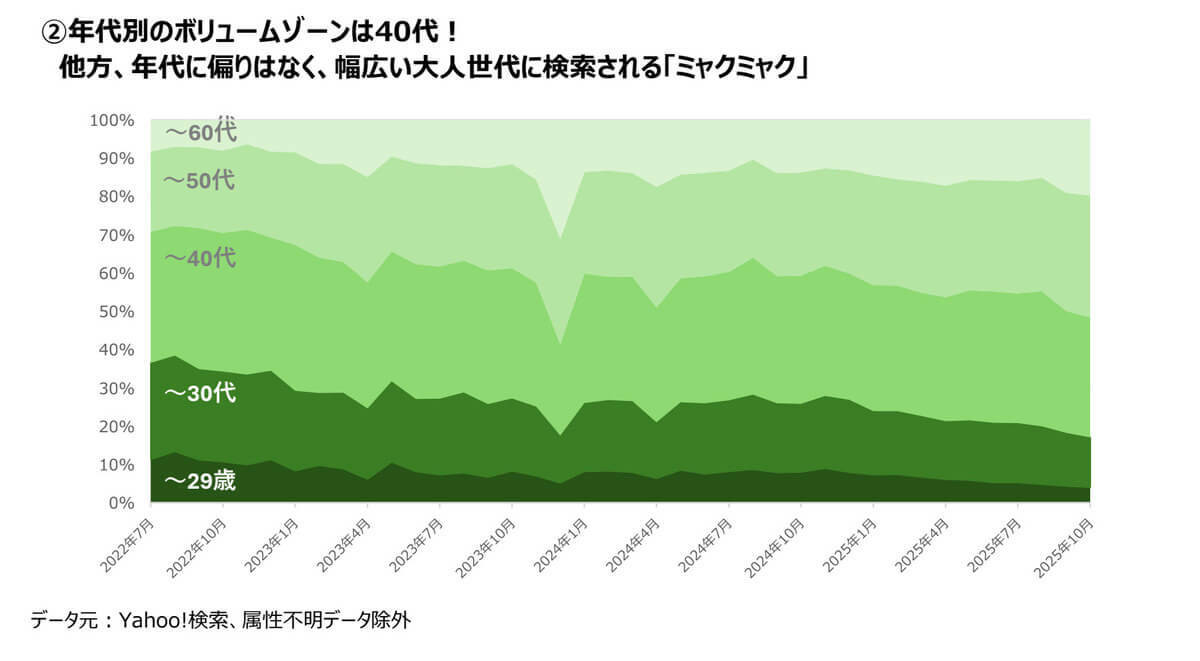 仕事や子育てなどに忙しい世代の人々が、好奇心や関心からミャクミャクを検索していた様子が伺えます。