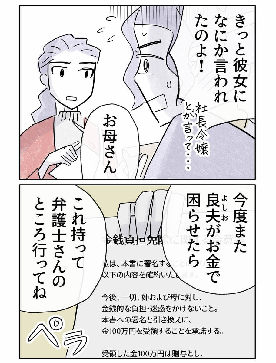 クズ弟と決着をつける手切れ金的に渡した「100万円」。大金がやりとりされたのを知って、お母さんはあ然!「そんな大金どこから……」と凛さんを問いただします。