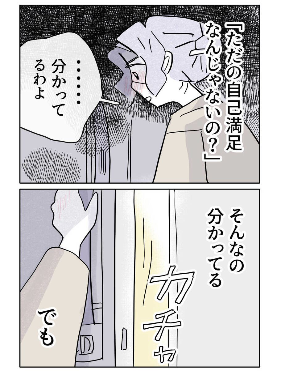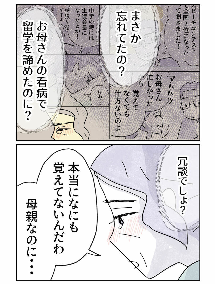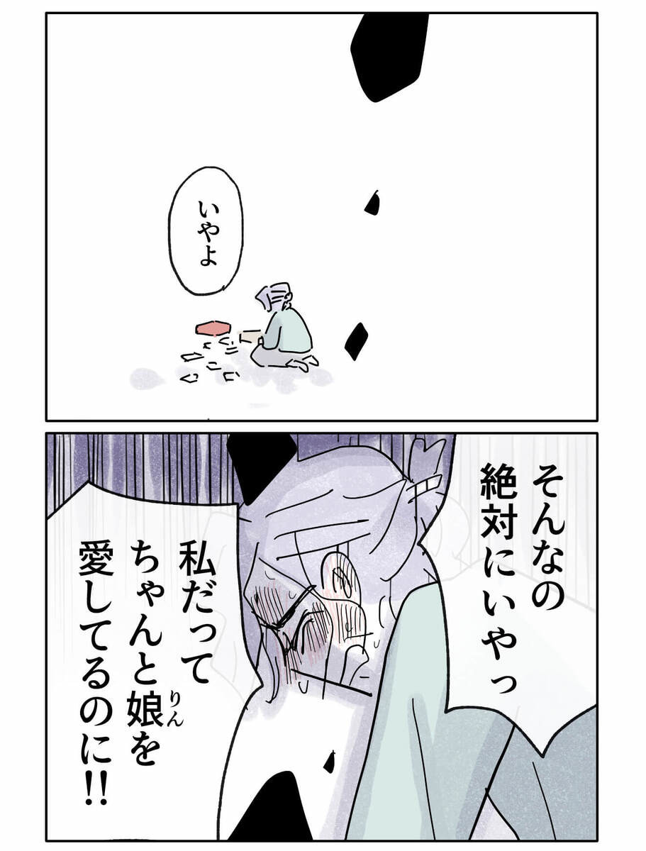 優秀な姉への劣等感から、娘の凛さんをついないがしろにしてきたお母さん。凛さんが去り、一人取り残されて初めて、自分がいかに娘の献身的な愛を「無関心」という刃で切り刻んできたかに気づき、暗闇の中で嗚咽しました。