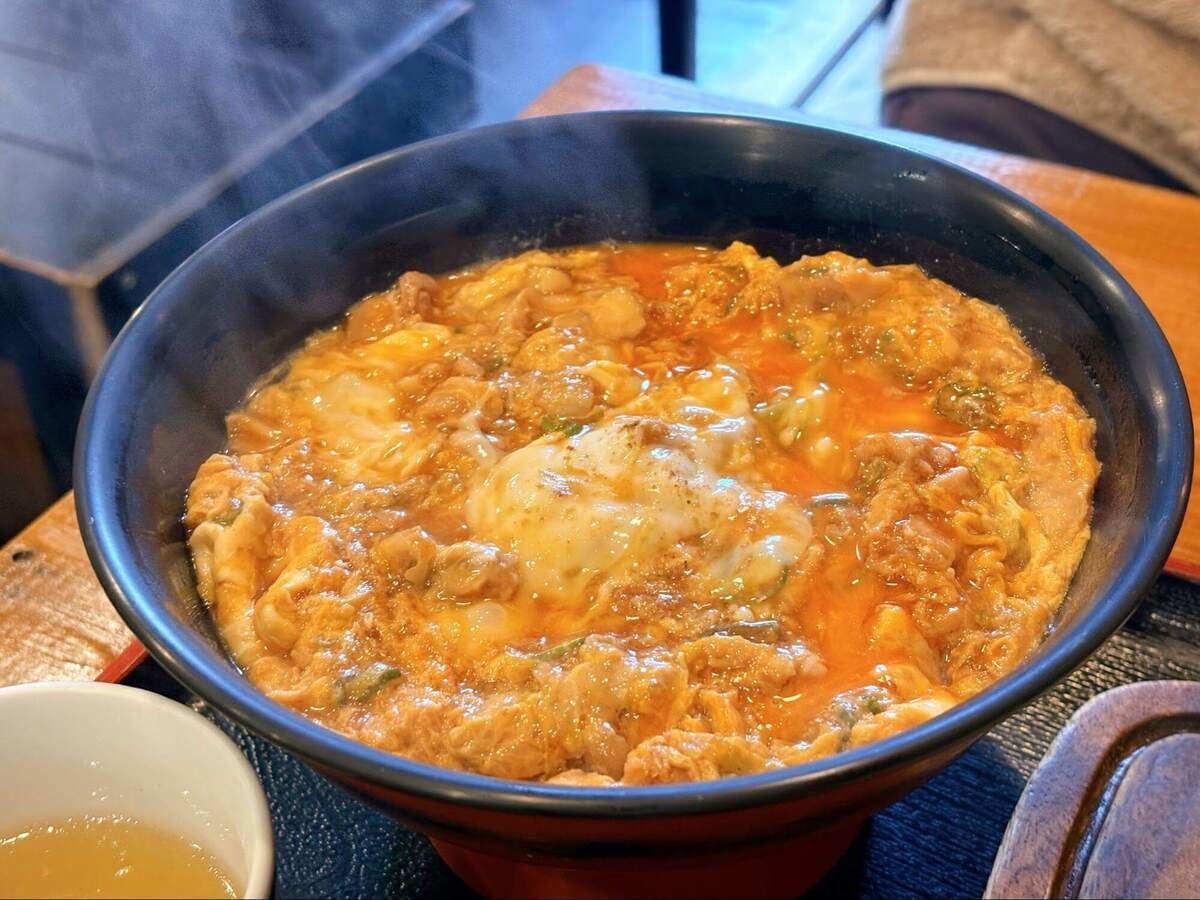 目の前に運ばれてきた親子丼は、一般的なものとは少し違う様子。色味はやや濃く、ネギが入ったとろとろの仕上がりで思わず見入ってしまうビジュアルです。