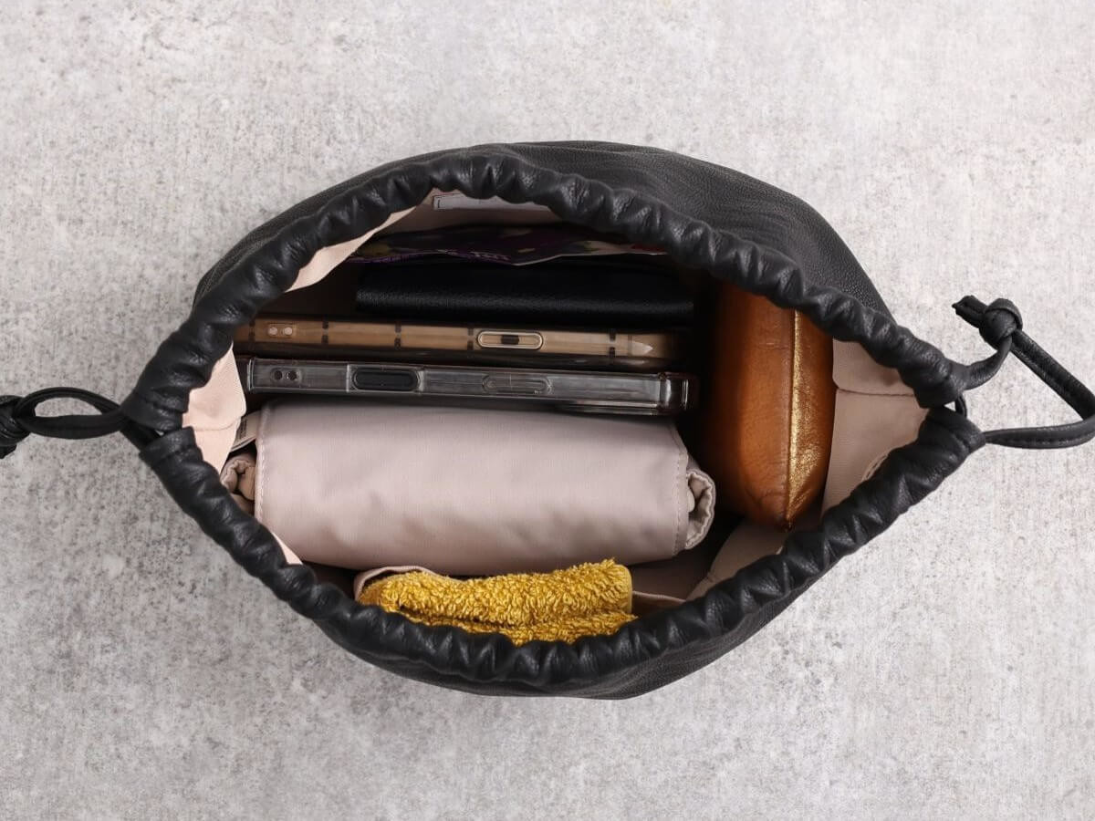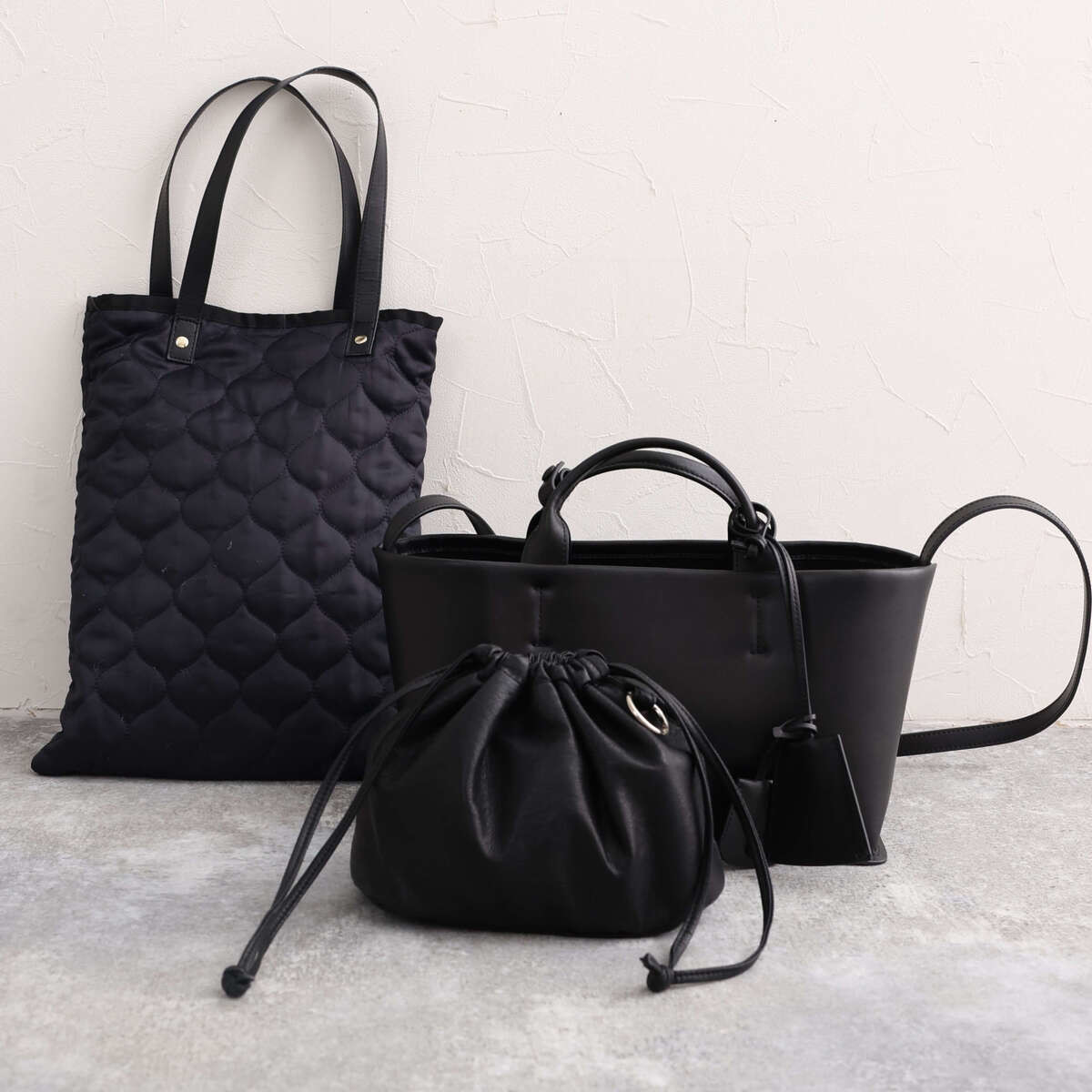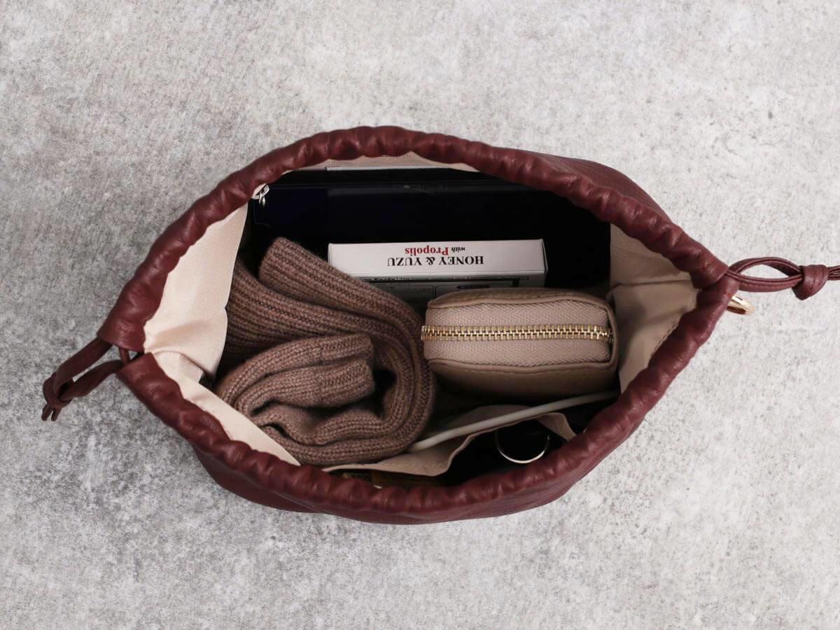 巾着バッグとしても、バッグインバッグとしても使えるマルチなアイテム。上品な見た目なので普段はもちろんお出かけシーンにも活躍してくれますよ。