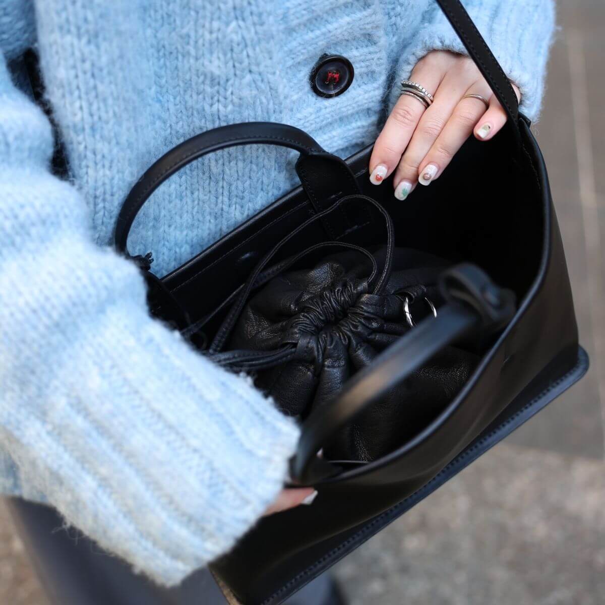 会社でお昼を買いに行くときや、お手洗いへ行くときなど、バッグを持つほどじゃないという時に巾着だけスポッと抜き取って持ち運べるのも便利ポイントです。