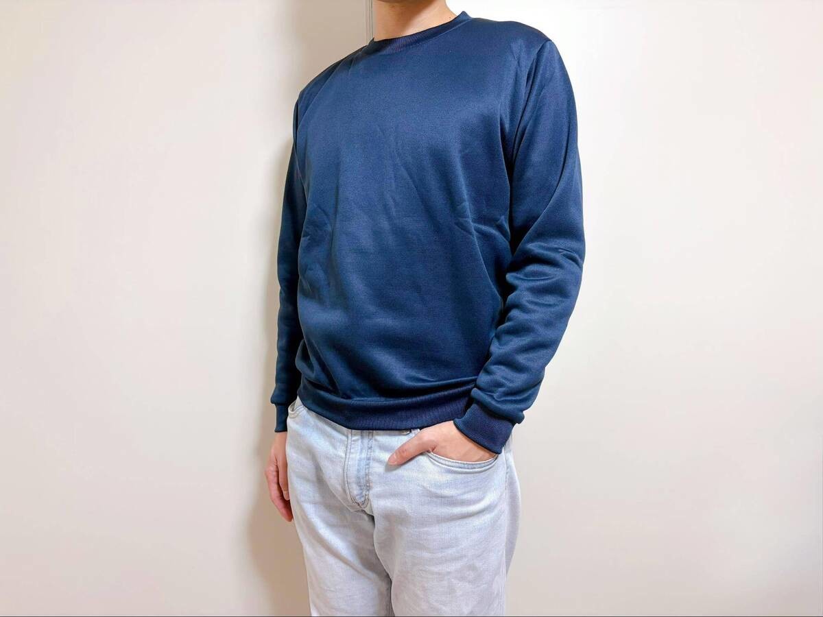 あれ、かなりあったかい!?実際に着ても生地は薄く感じますが、家にあるユニクロやGAPのスウェットと遜色なさそうです。