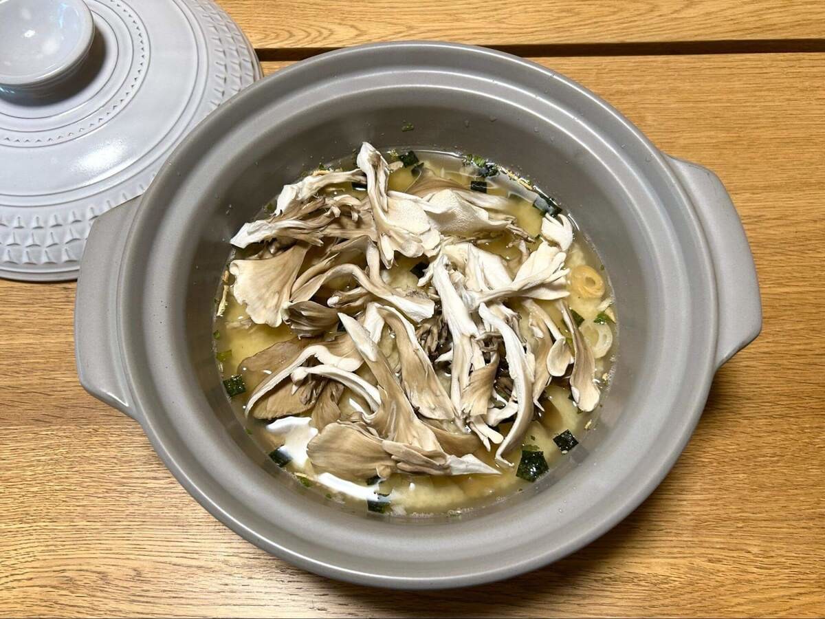 浸水させておいた米を土鍋に移し、そこに舞茸、お吸い物の素(松茸の味お吸いもの)、めんつゆ、酒、水500ml(分量外)を入れます。