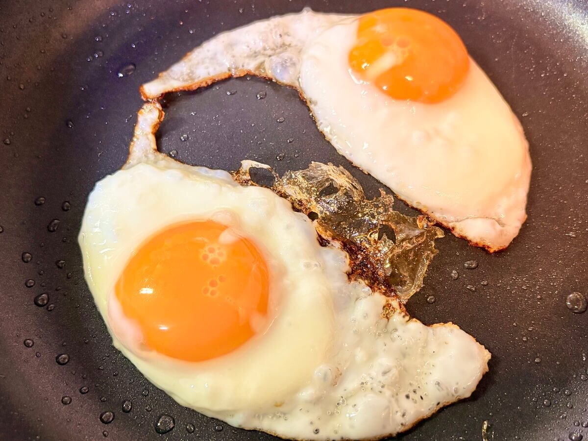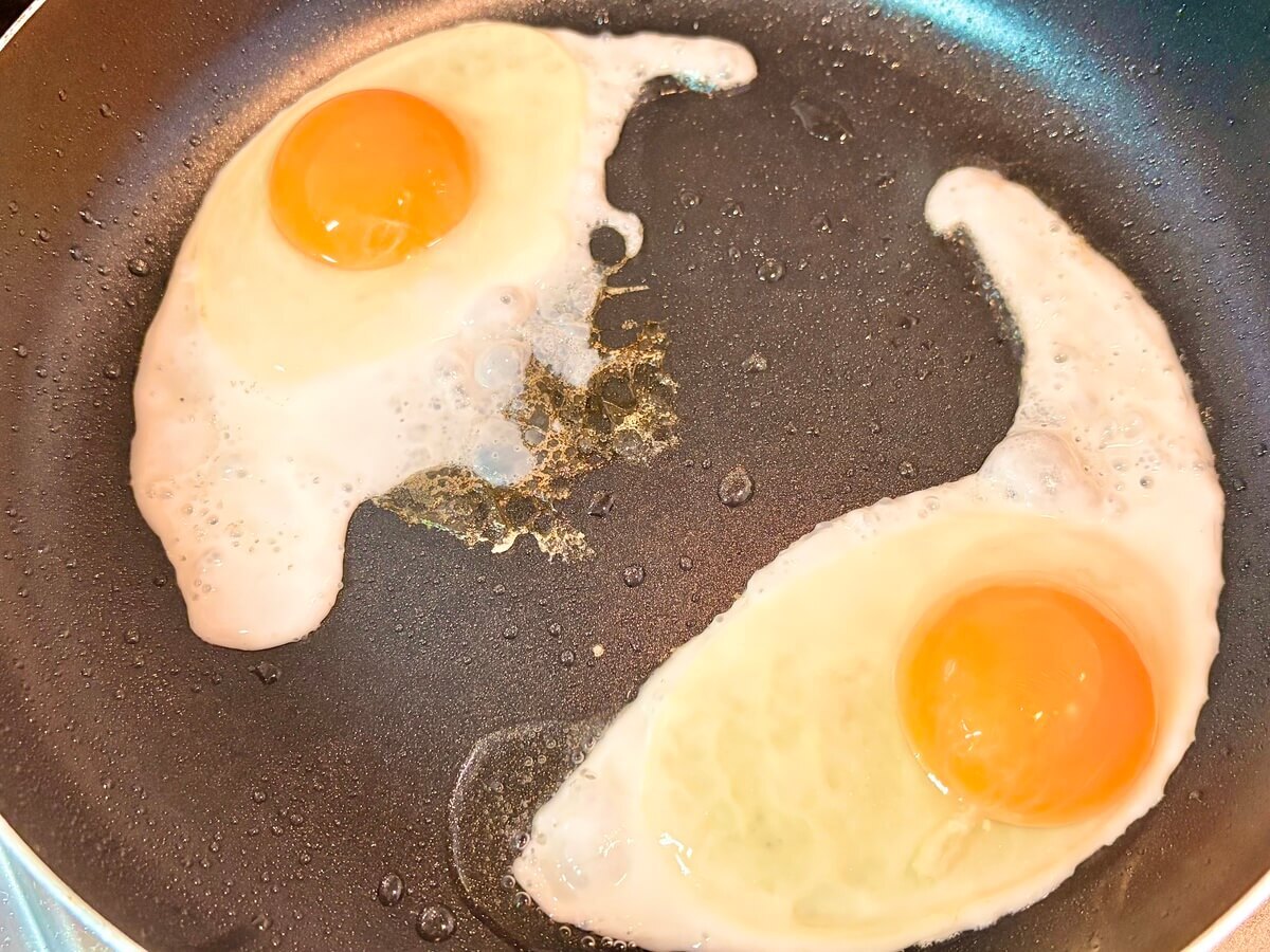 同じフライパンに玉子を2個割り入れ、目玉焼きを作ります。