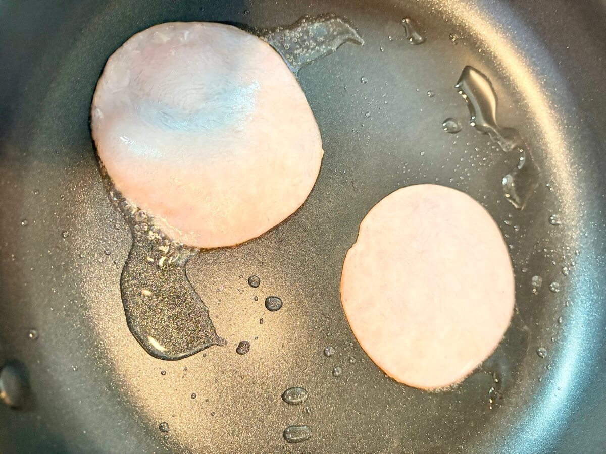 この時、強火にしてしまうとハムが焦げてしまうので注意(筆者は無事にフチを焦がしました……)。