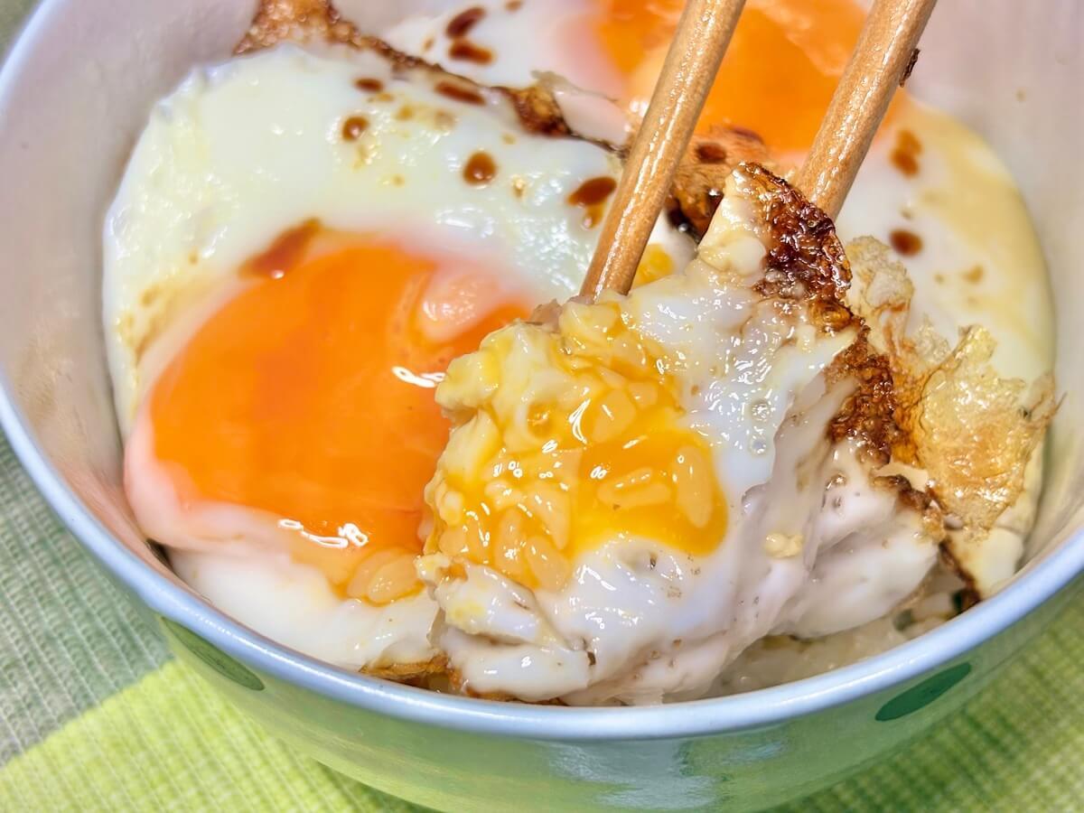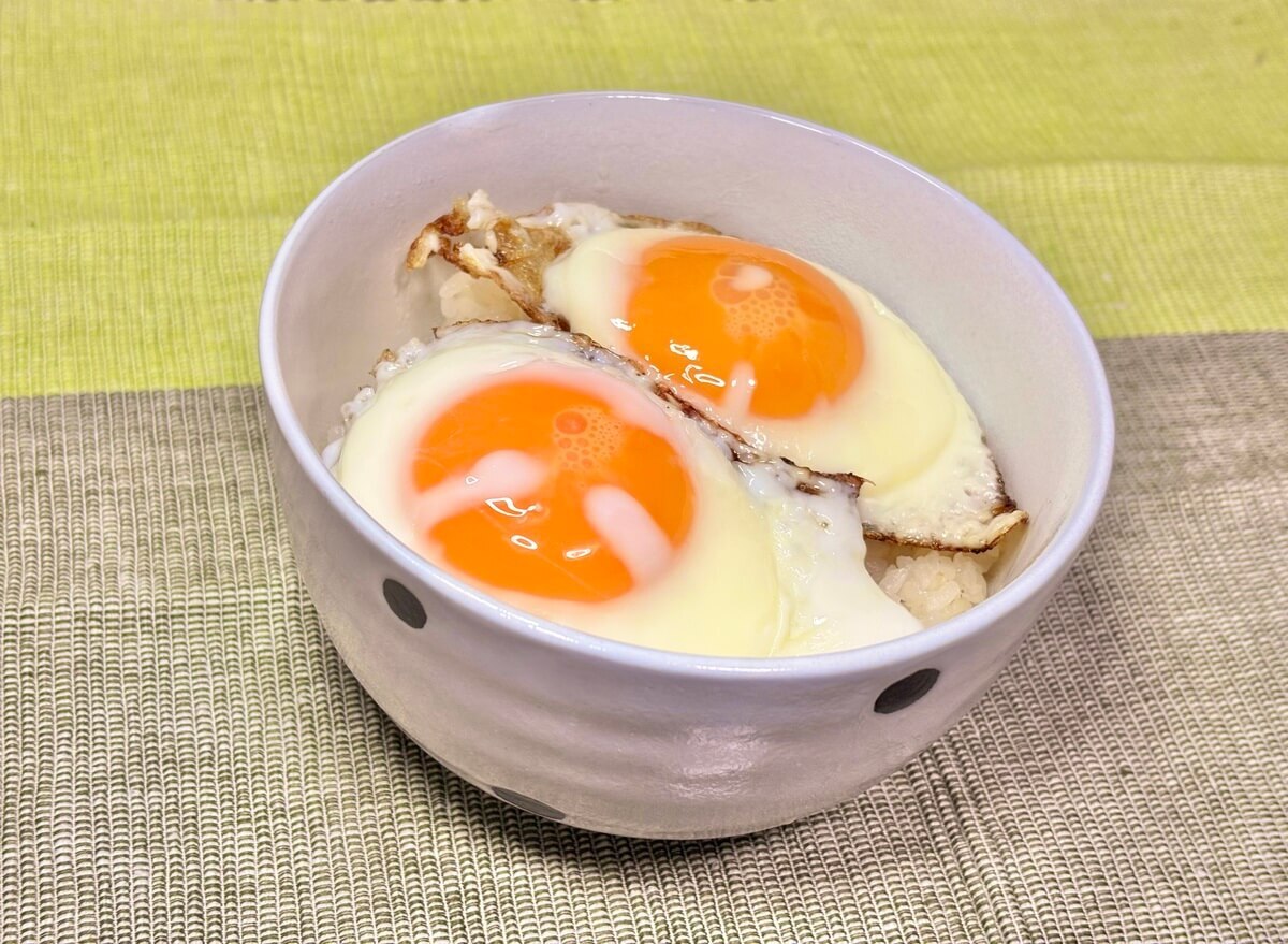 目玉焼きが焼けたら、先ほどのハム乗せごはんの上に、さらに目玉焼きを重ねます。