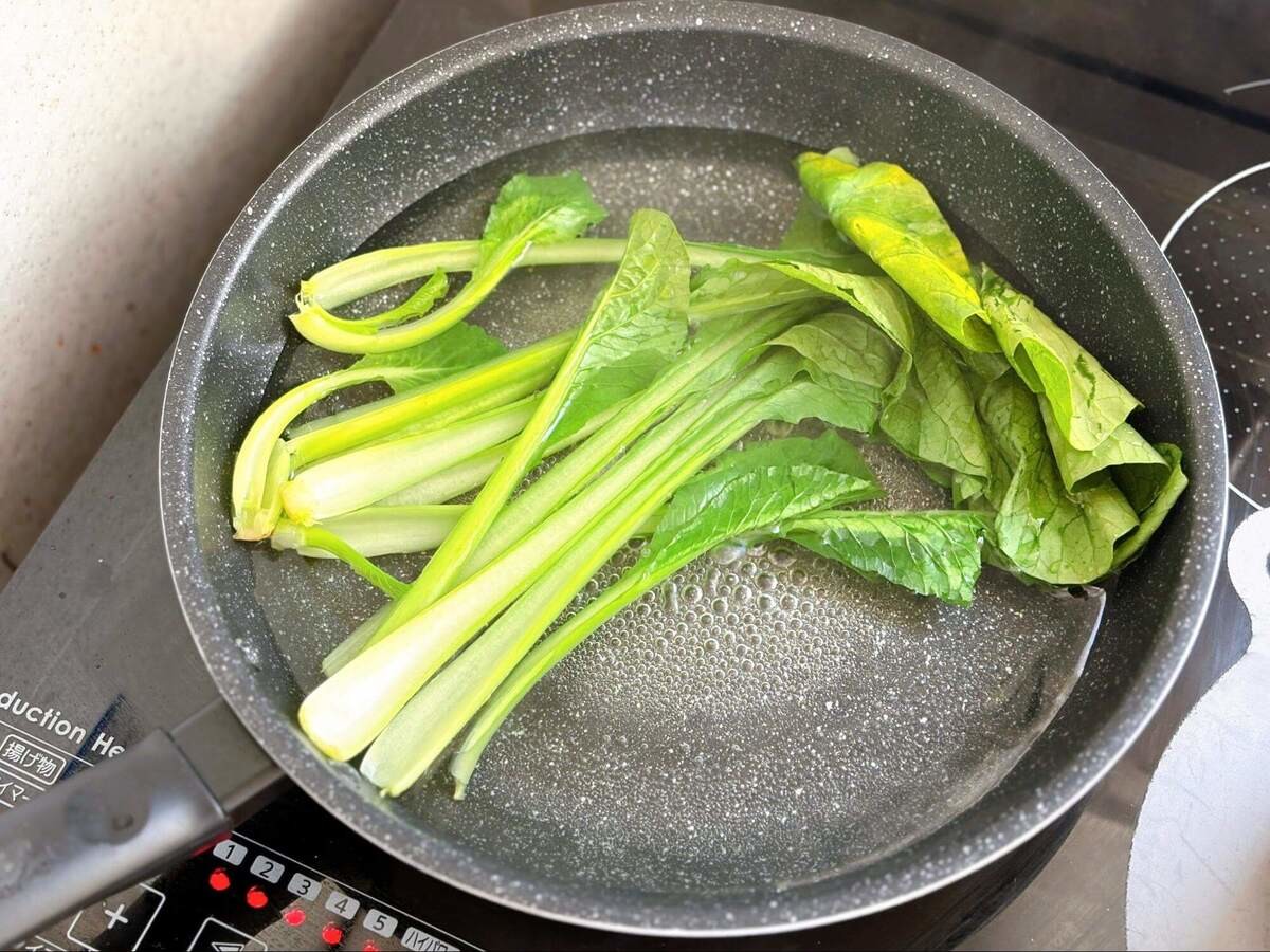 お湯が沸騰したら、小松菜を入れて1分ゆでます。