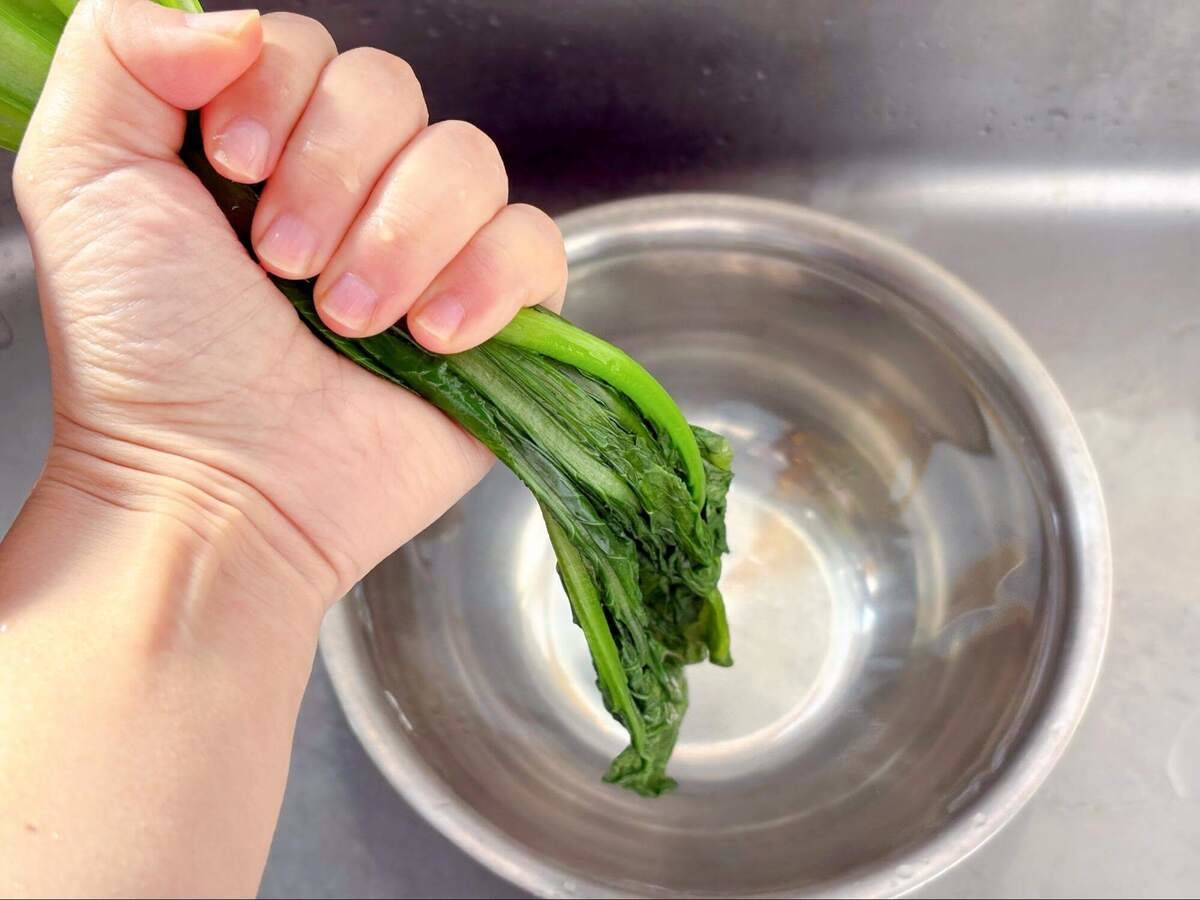 冷水で冷まして水気を絞りましょう。水分が残っていると味が薄くなってしまうのでギュッと絞ってくださいね。
