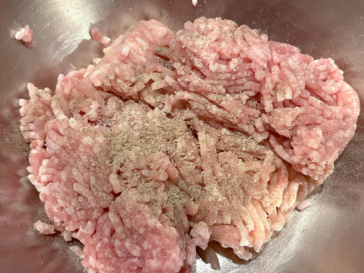 ボウルに豚と鶏のひき肉を入れ、塩・こしょうをして粘りが出るまで練りましょう。鶏肉は水分量が多いので、豚肉だけで作るよりもしっとりとジューシーに仕上がるそうですよ。