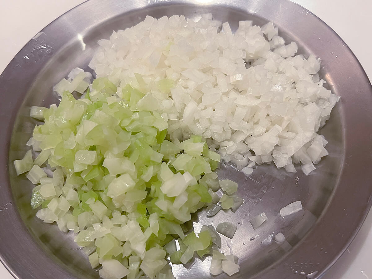 削ぎ取った芯もみじん切りにして玉ねぎのみじん切りと一緒にしておきます。
