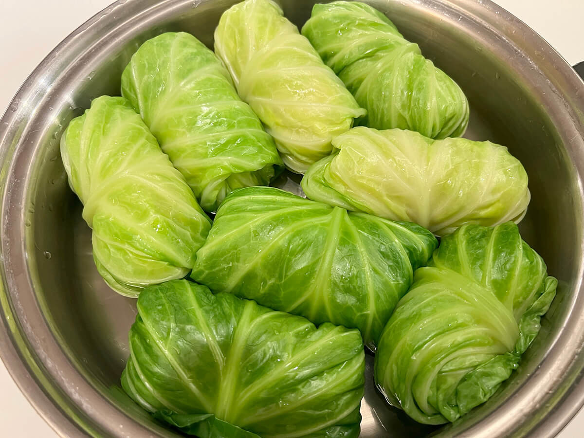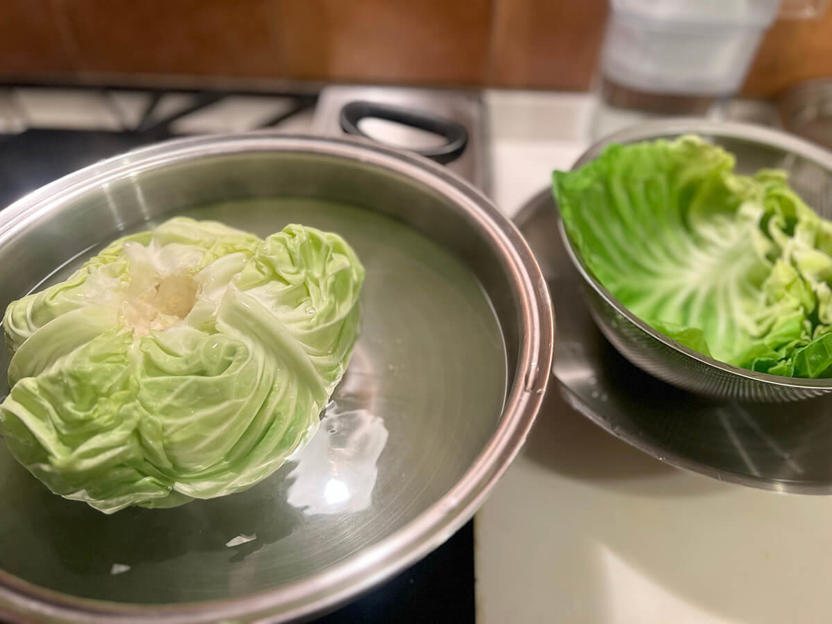 丸のままのキャベツをどぶんと熱湯につけてするするとむいていくこと、かたい芯を削いで丸めやすくすること、葉は2重にするとしっかり巻けるうえ野菜の量感が増し、味わい深くなること。