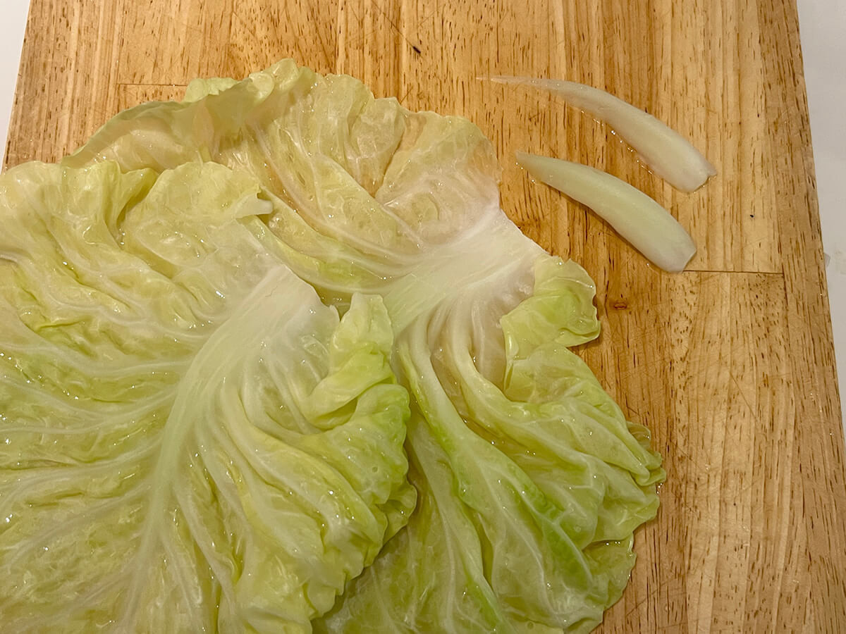 やわらかくなったキャベツの葉の白くかたい部分は削ぎ取ります。これで格段に巻きやすくなるのですね。