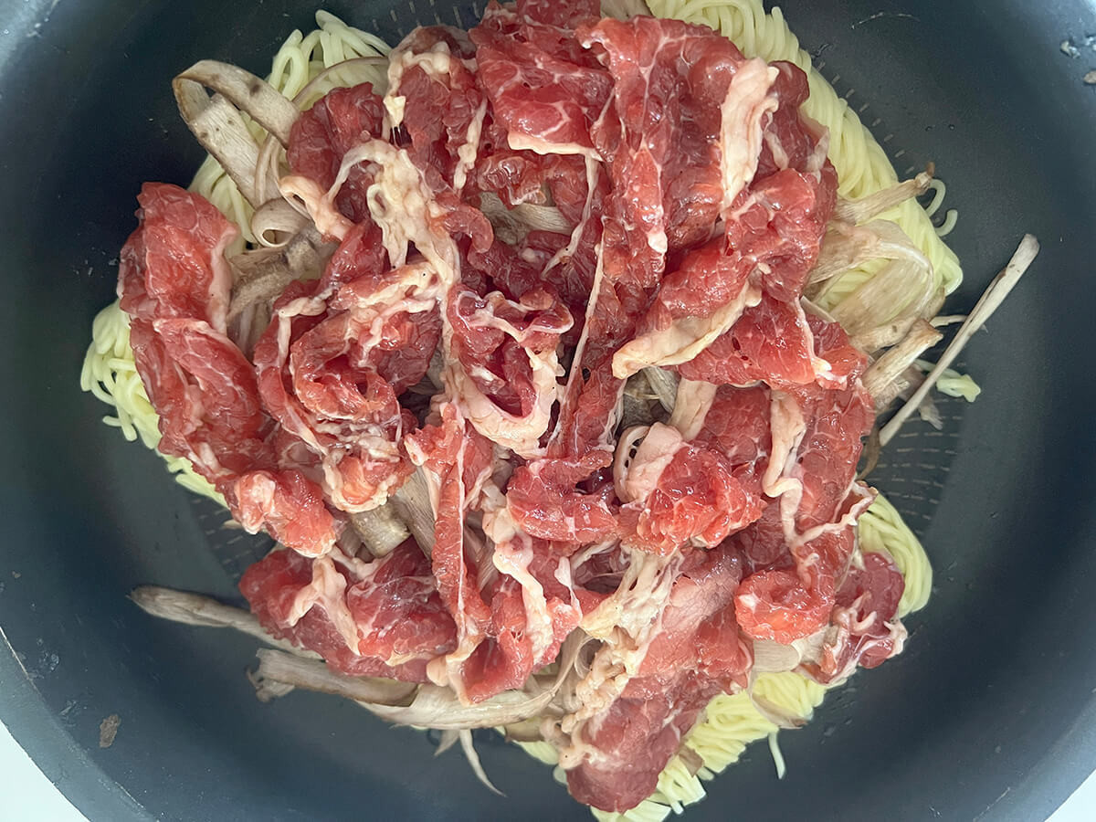 6分経ったところが上の写真。まだ牛肉には赤い部分が残っていますが、麺やごぼうにはしっかり熱が入っているように見えます。