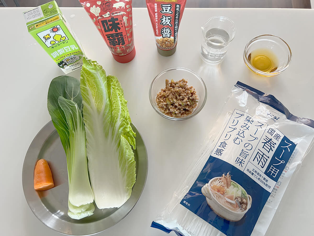 春雨は、八百幸のPB商品の中から、スープ用というのを選びました。お好みの具材として、肉味噌などのせるといいそうなので、肉味噌も作り、野菜は白菜、にんじん、青梗菜を用意しました。中華調味料として味覇を使います。