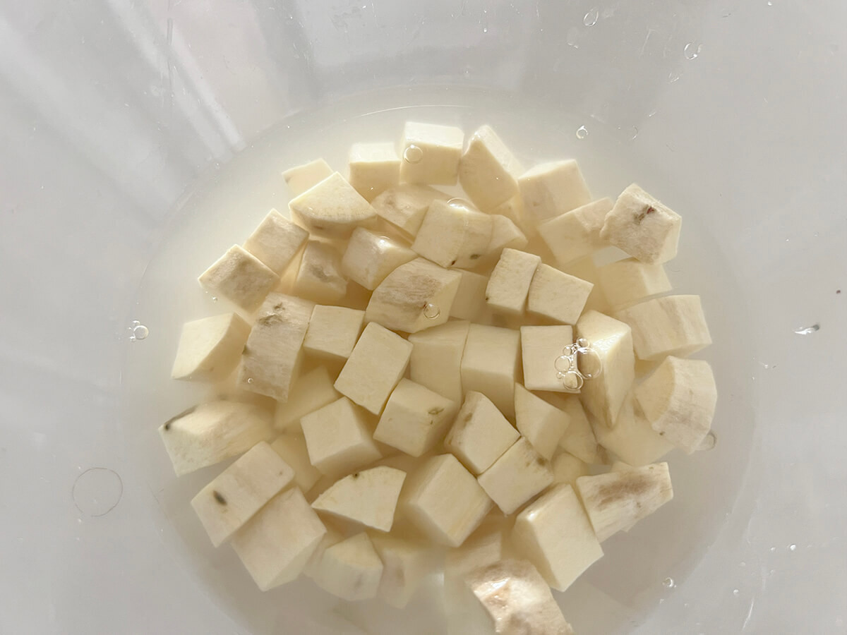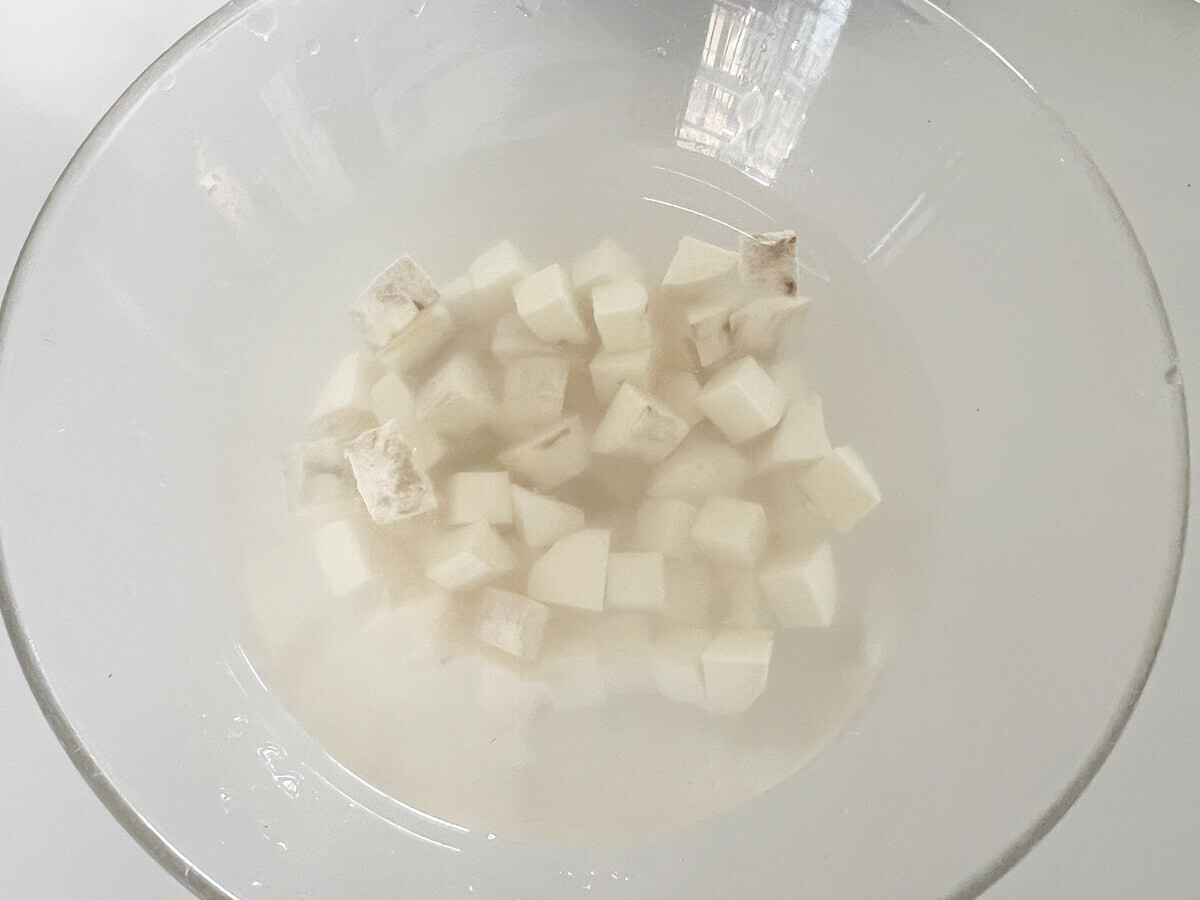 さつまいもの皮をむき、1cm角に切ったら10分程度水にさらしてアク抜きをしましょう。