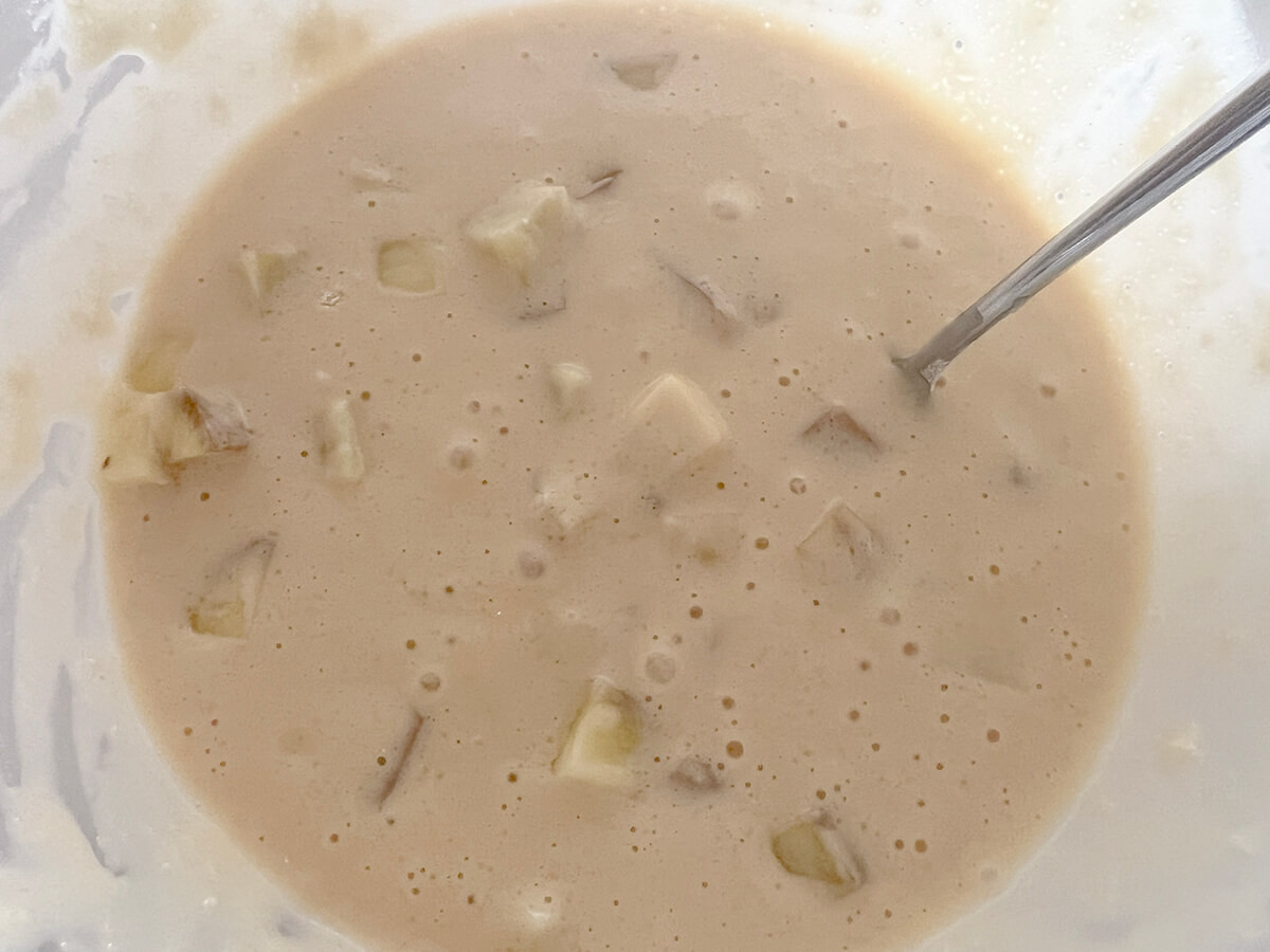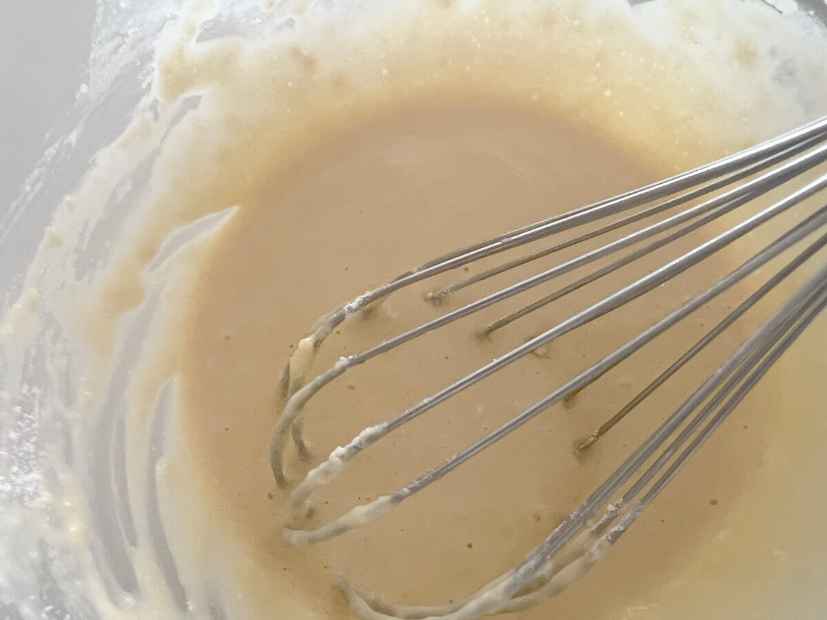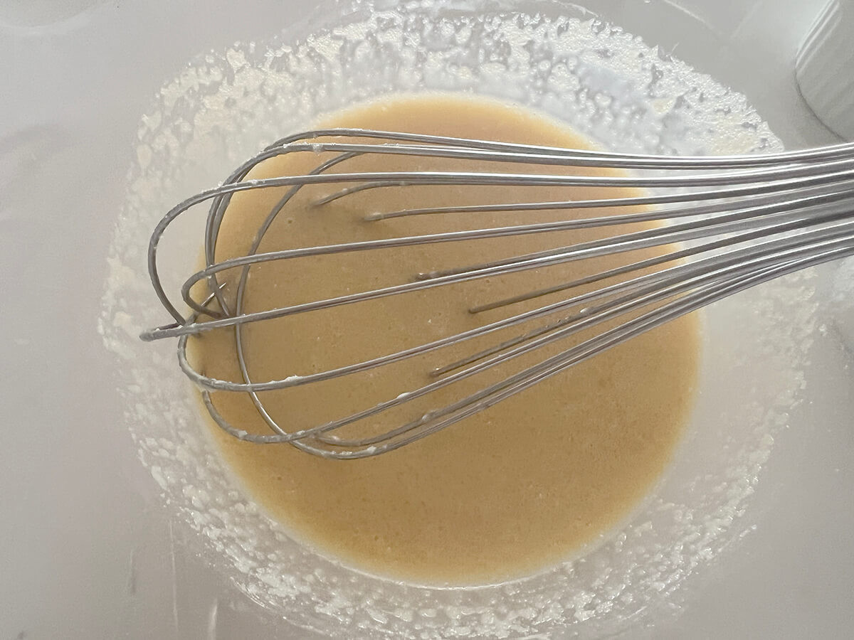 泡立て器で混ぜながら、溶かしたバター、砂糖も加えていきます。上の写真は砂糖まで入ったところです。