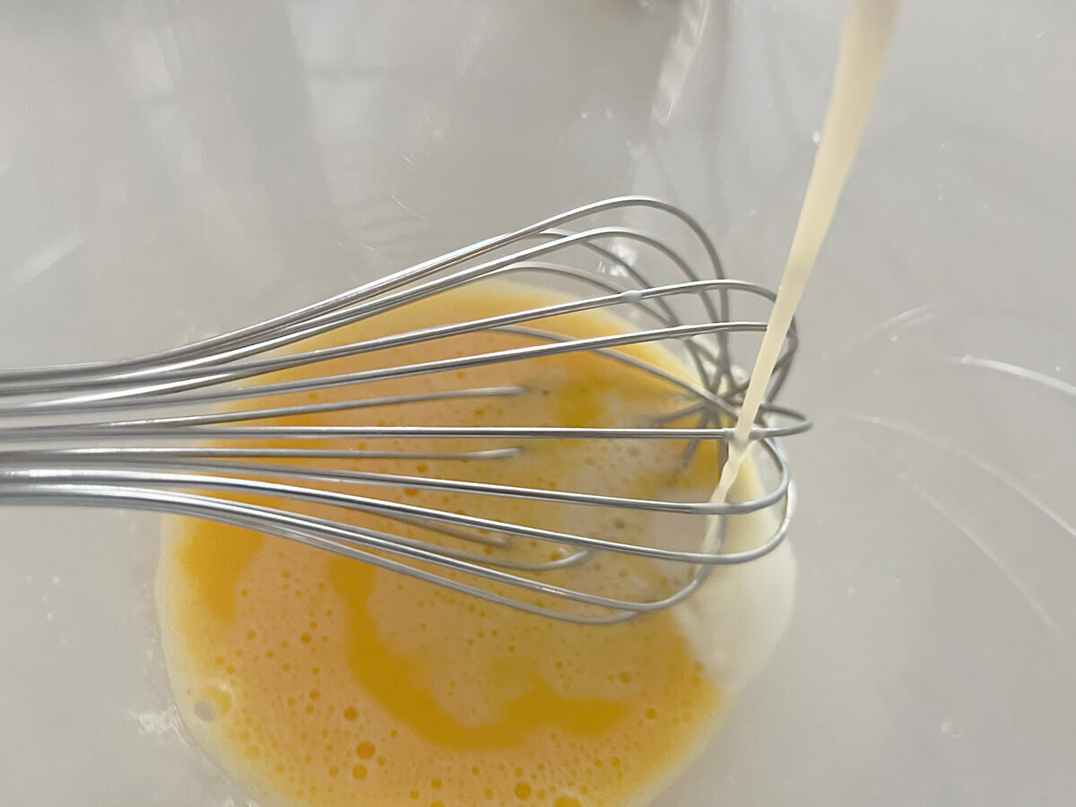 ボウルに卵を割り入れ、がっつりしっかり混ぜます。そこに豆乳もしくは牛乳を投入。