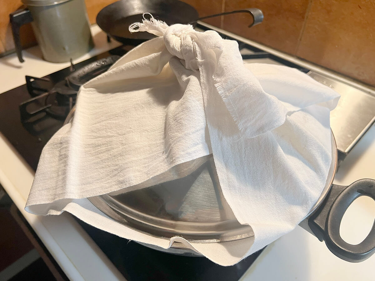 蓋から水滴が落ちないように、蓋に布巾をかませ、弱めの中火で15分蒸しましょう。