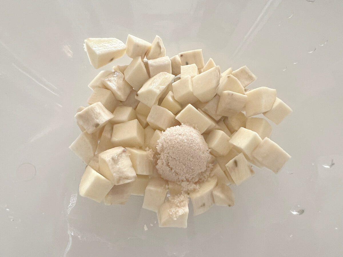 加熱後のさつまいもです。写真ではあまり分かりませんが、やわらかくなっています。水気を切り、そのまま一旦置いて粗熱をとります。