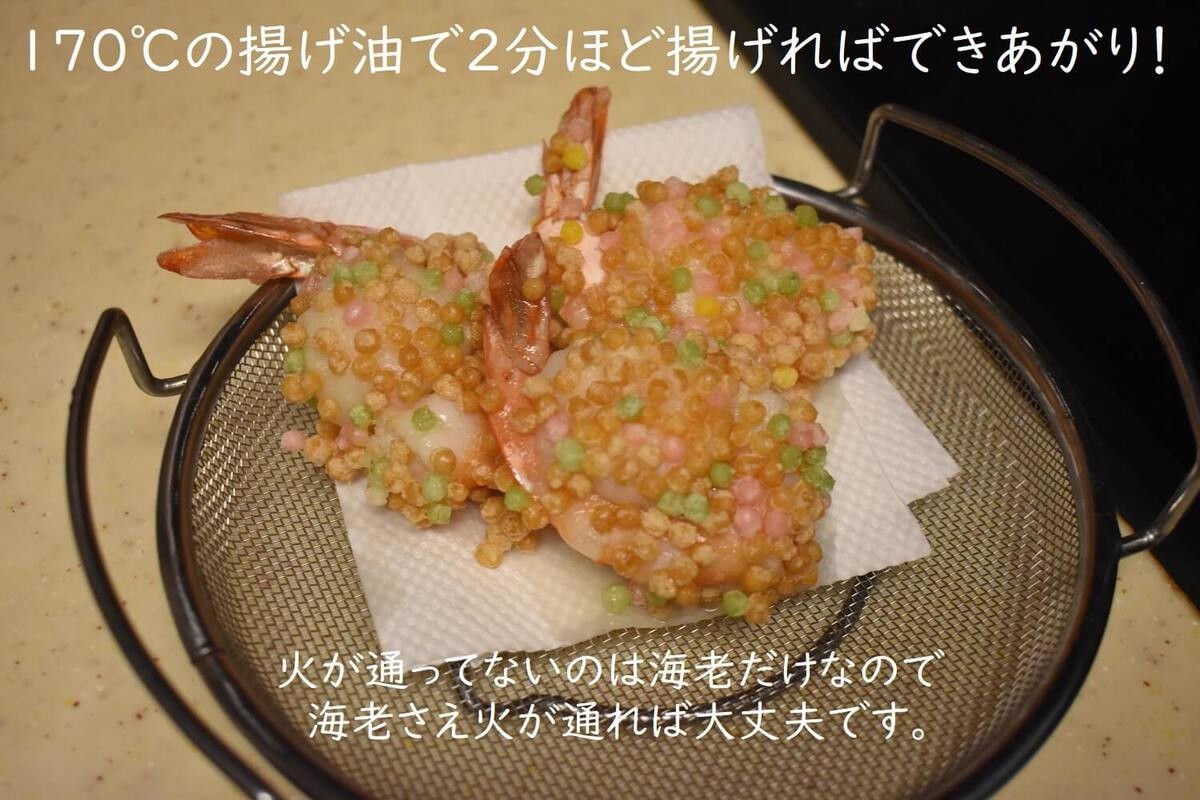 火が通っていないのは海老だけなので、揚げ時間は短めです。そして、高温だとあられが焦げてしまってせっかくのきれいな色が茶色になってしまうため、揚げ油は170℃くらいがベスト。