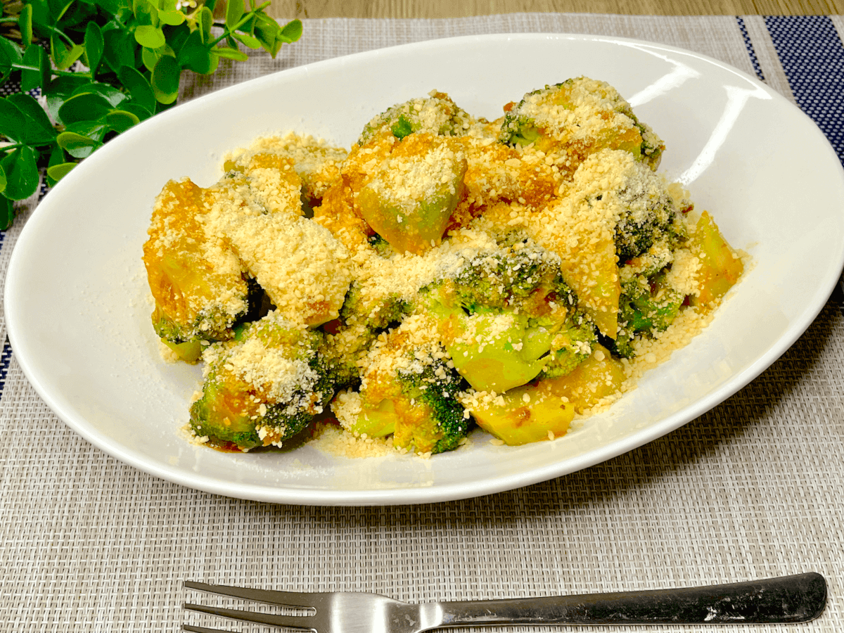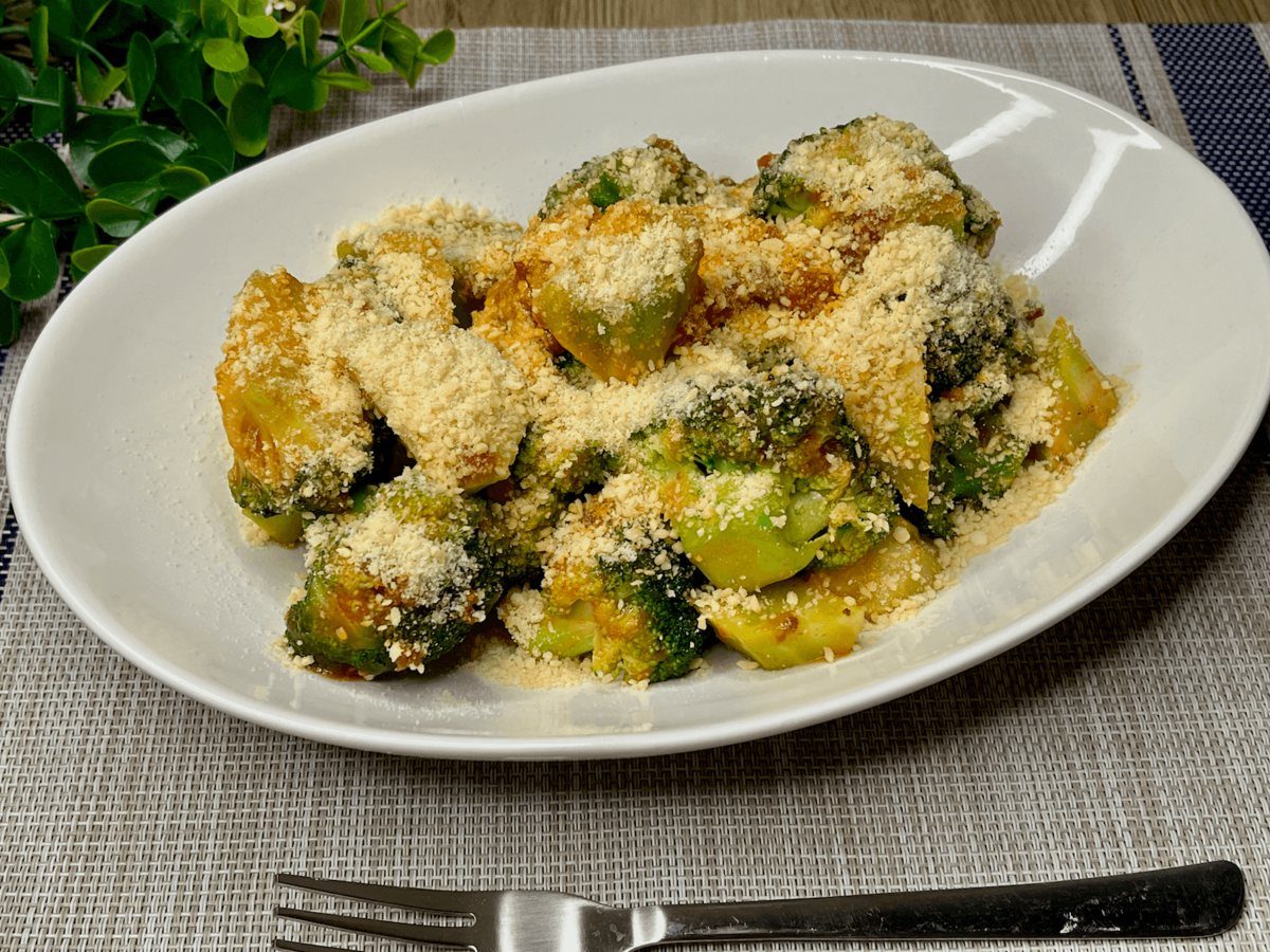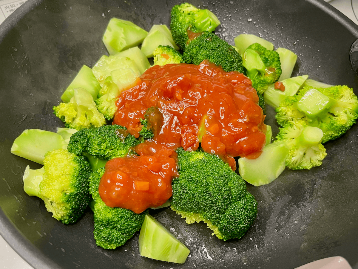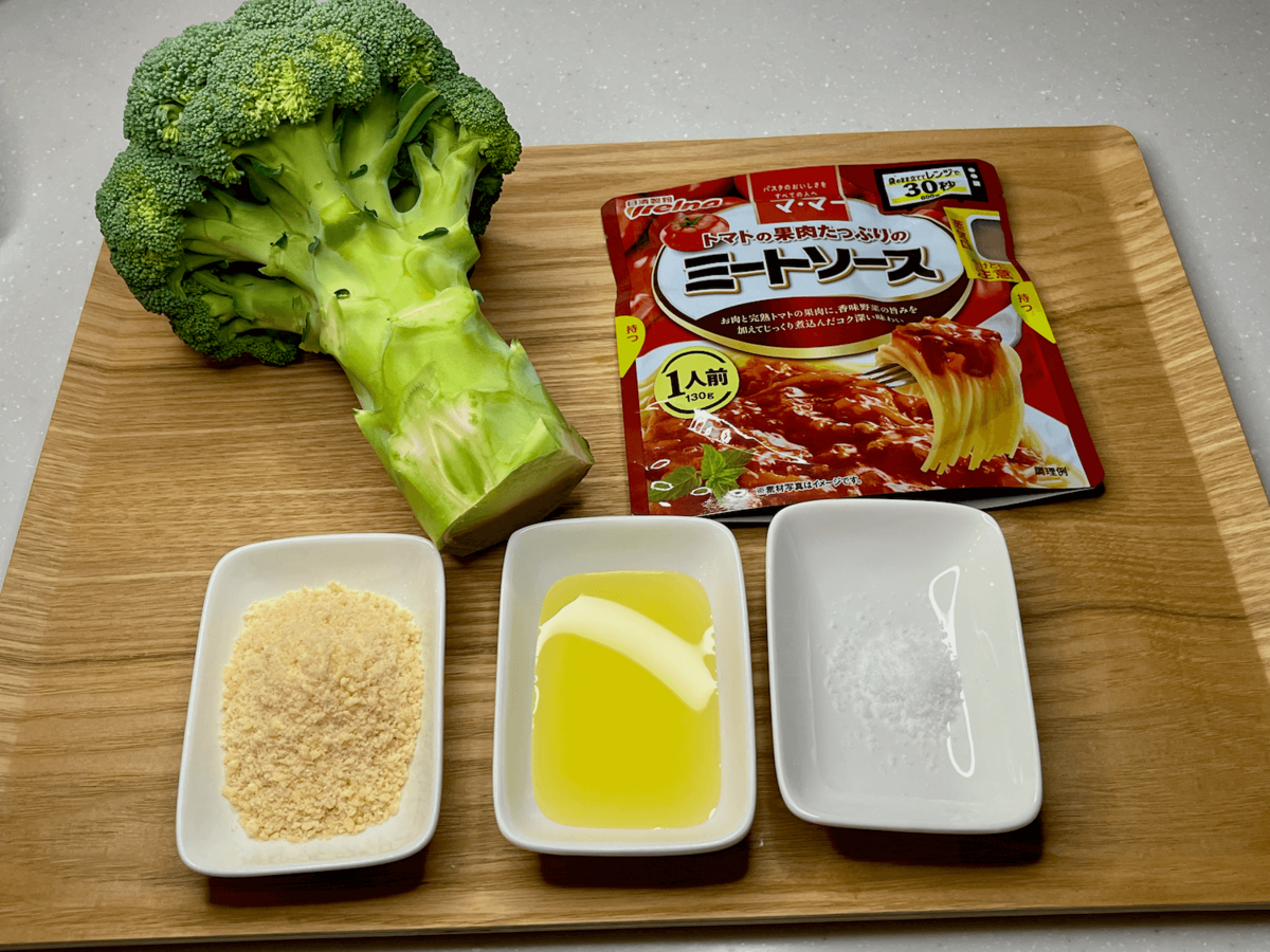 「ブロッコリーのソテーミートソース」は、ブロッコリーを茹でて焼き、ミートソースをかけるという超シンプルレシピ。