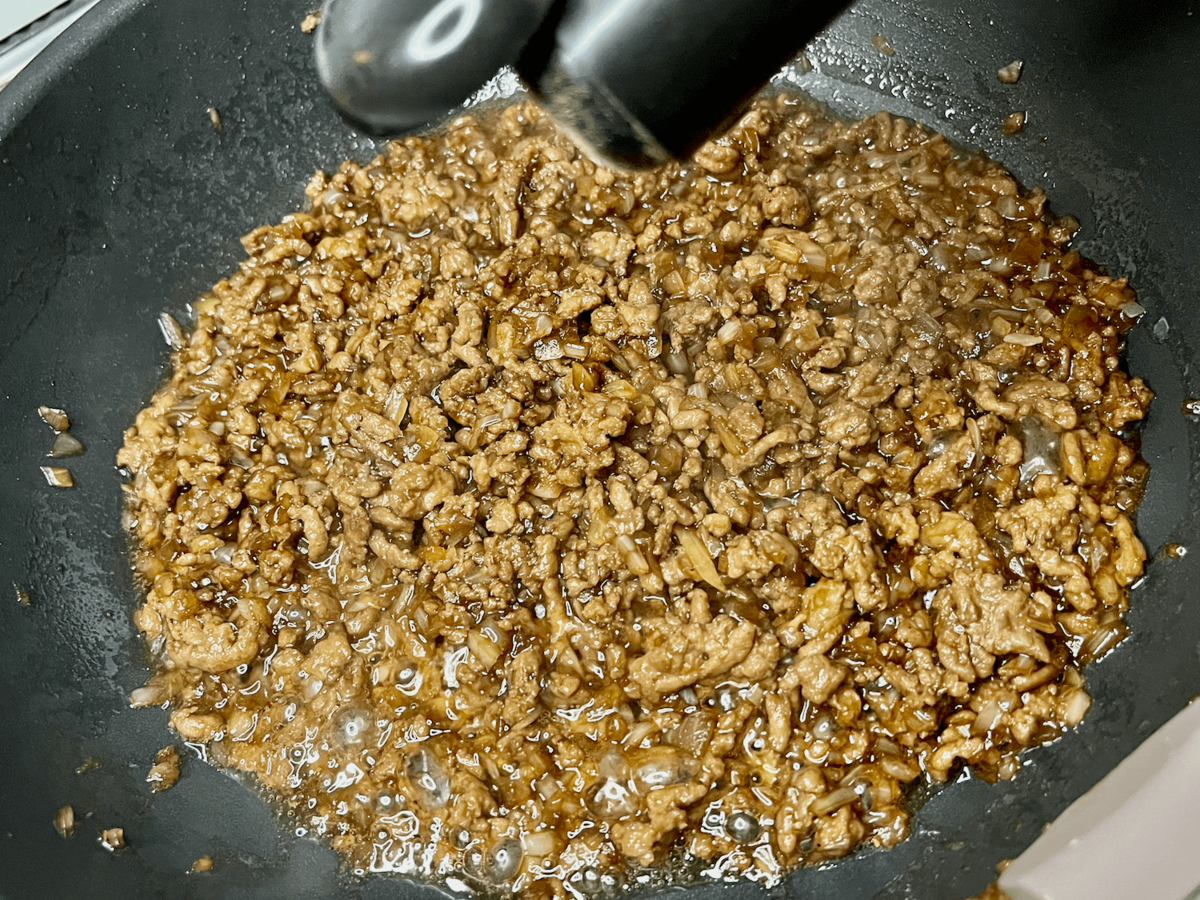 そこへ炒めた合い挽き肉を加え……