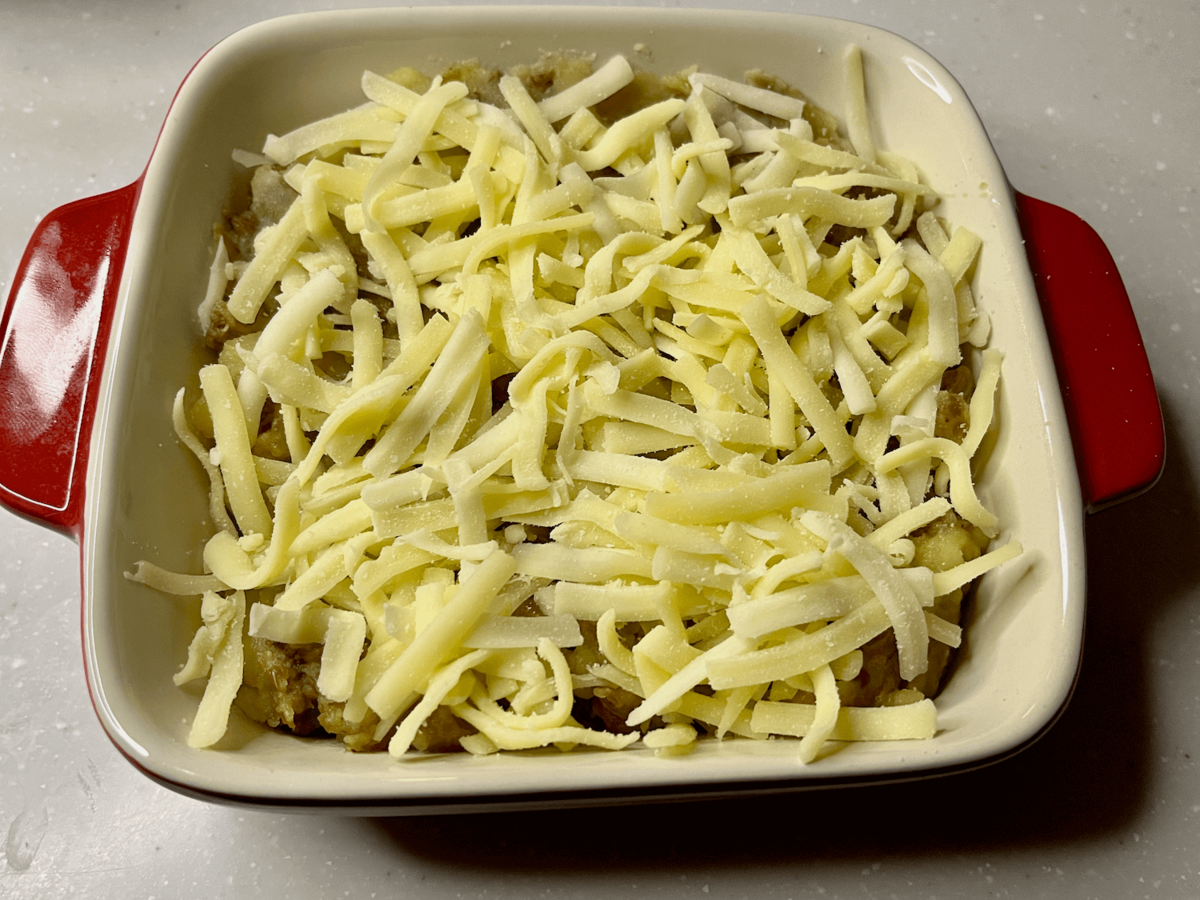 耐熱容器に⑤の合い挽き肉と合わせたじゃがいもを入れ……