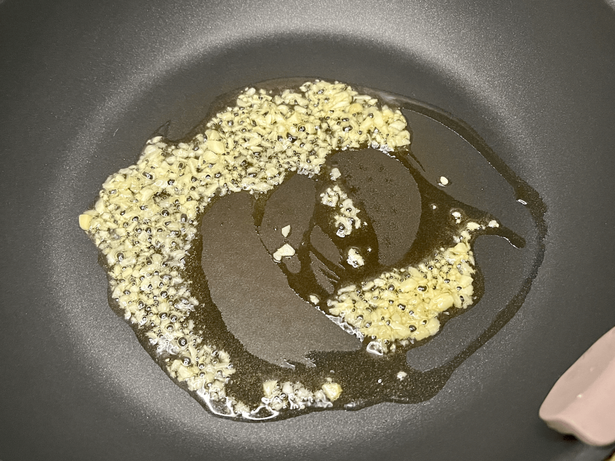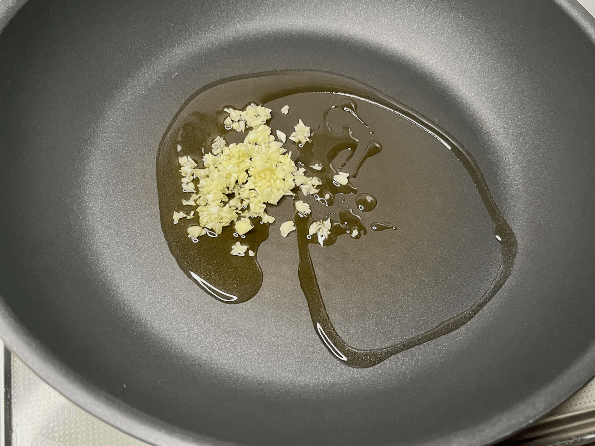 フライパンにオリーブオイルとにんにくを入れて……。