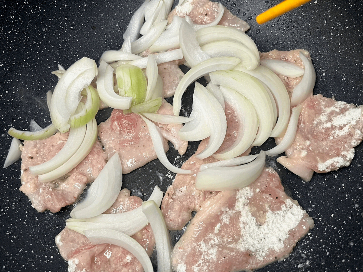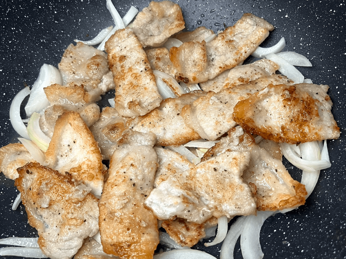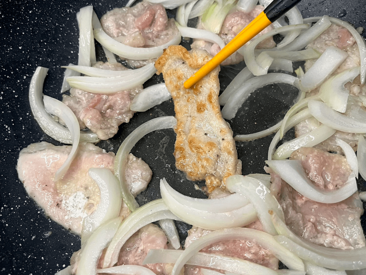 豚肉はあまり動かさず焼き色をつけ、玉ねぎは焦げないよう、こまめにひっくり返します。