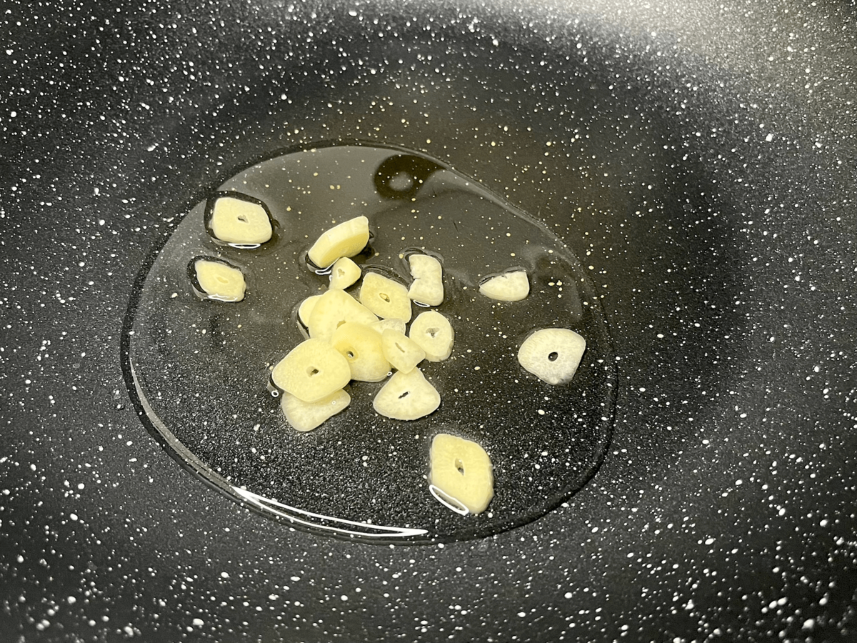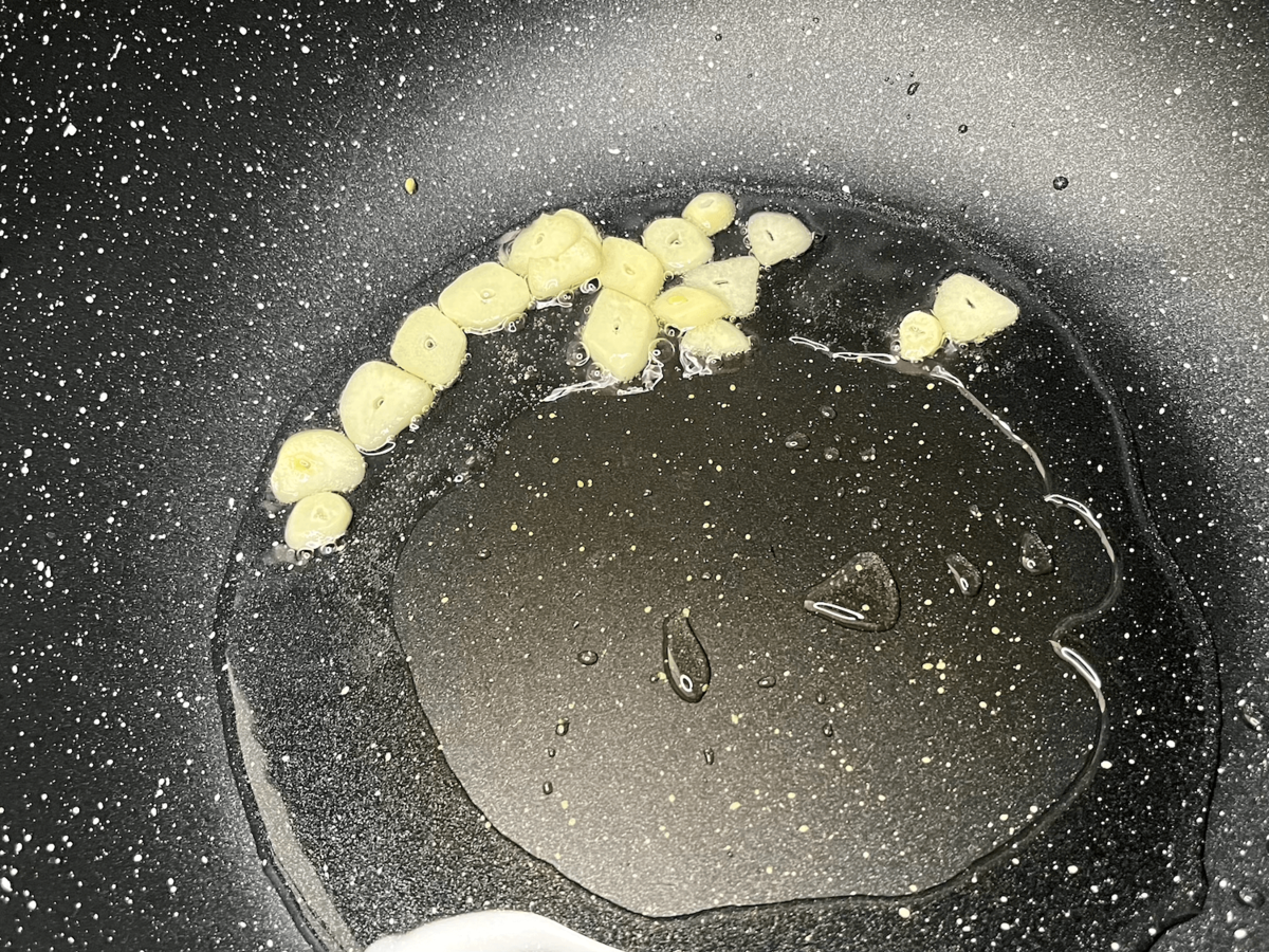 フライパンにサラダ油とにんにくを入れます。