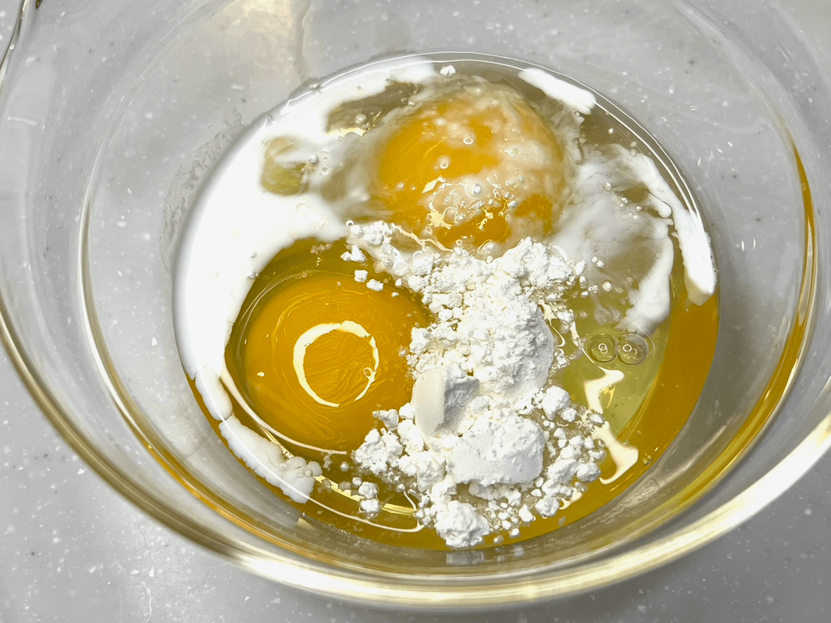 卵と片栗粉、牛乳を入れ、混ぜ合わせます。