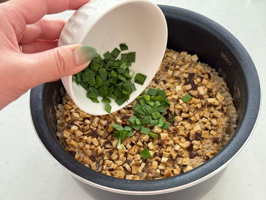 その上に、5mm角程度に小さく切った具材(ニラ以外)を入れて、あとはいつも通り炊飯するだけ。