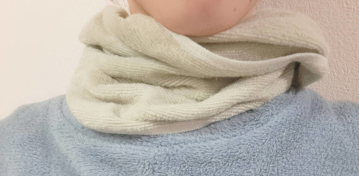 頭から被って首に巻けば、ネックウォーマーとしても活躍します。縦幅が長めのタオルなので、首全体を覆ってくれますよ。