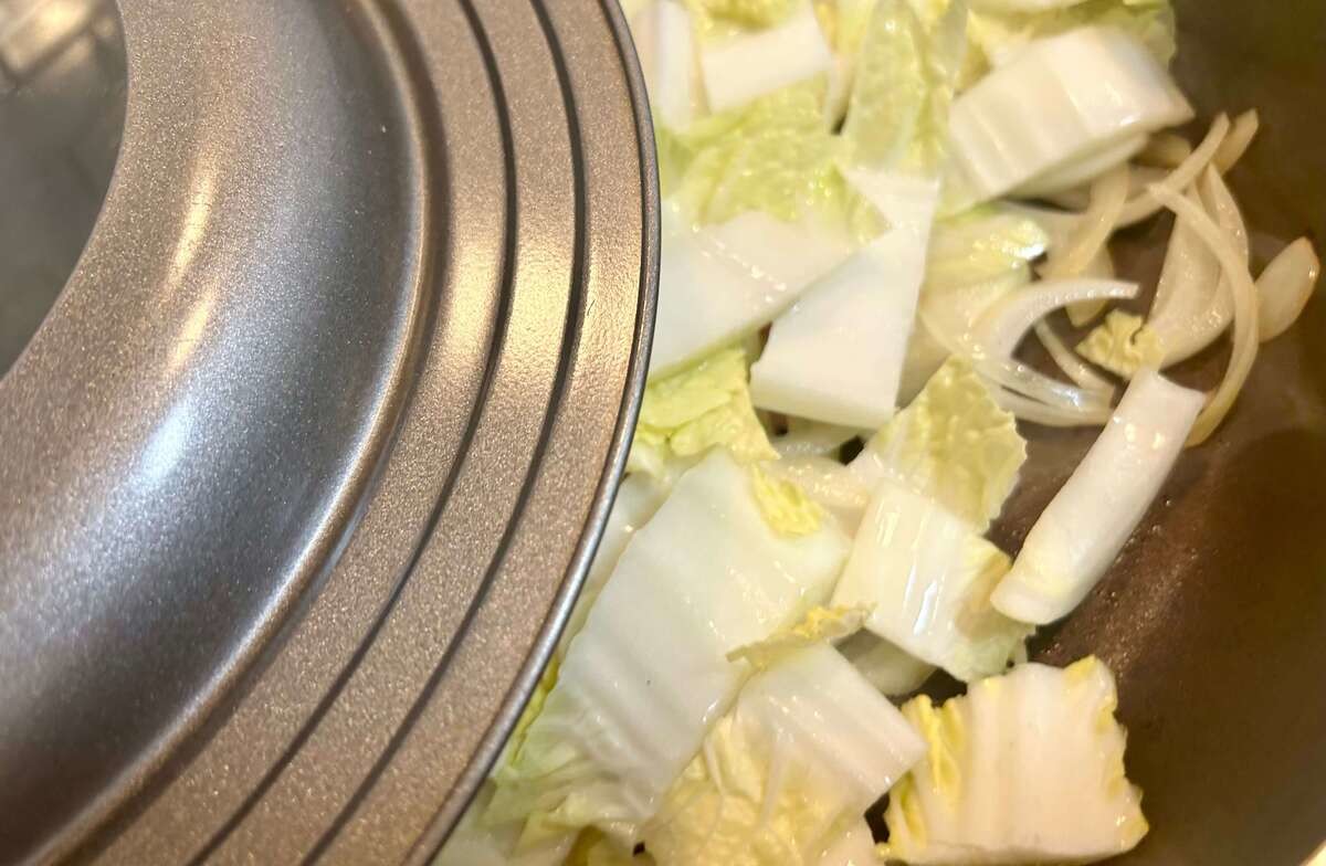 白菜の硬い部分を加えたら、弱火で軽く炒めてフタをします。