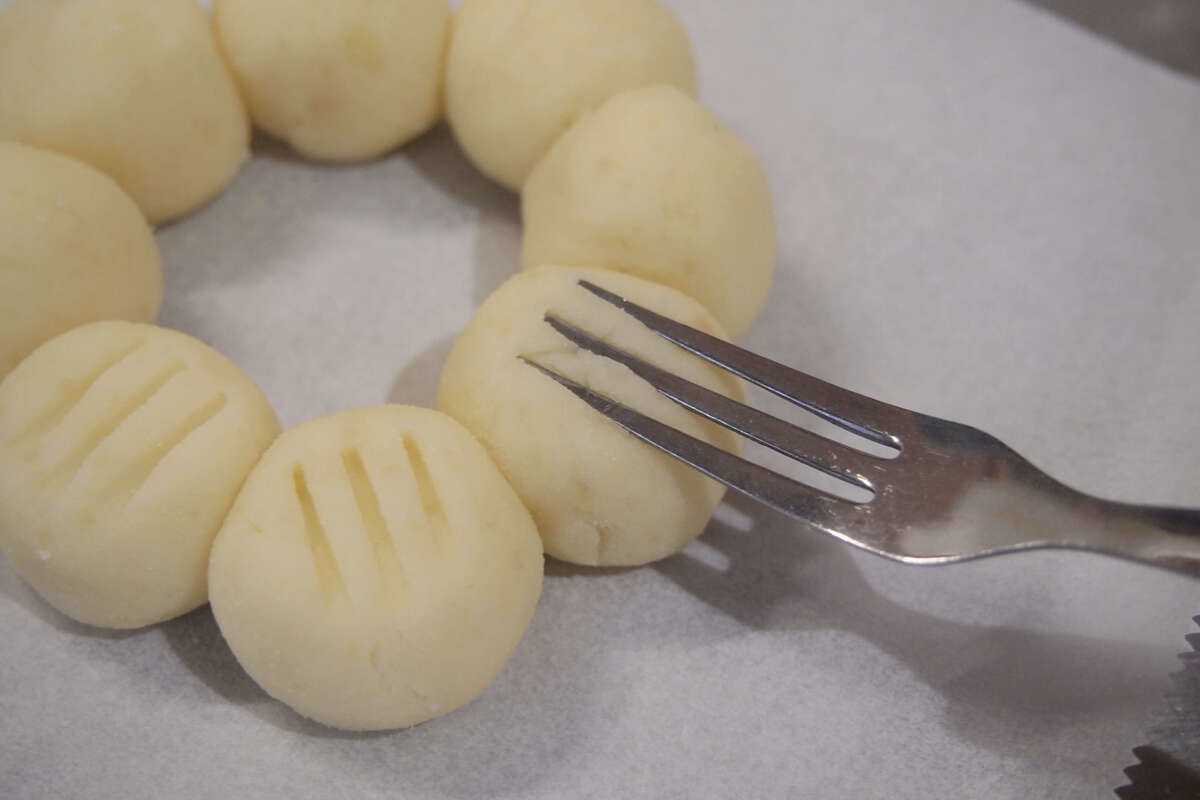 クッキングシートにのせ、爆発防止のためフォークをぎゅっと押しつけ、型をつけます。