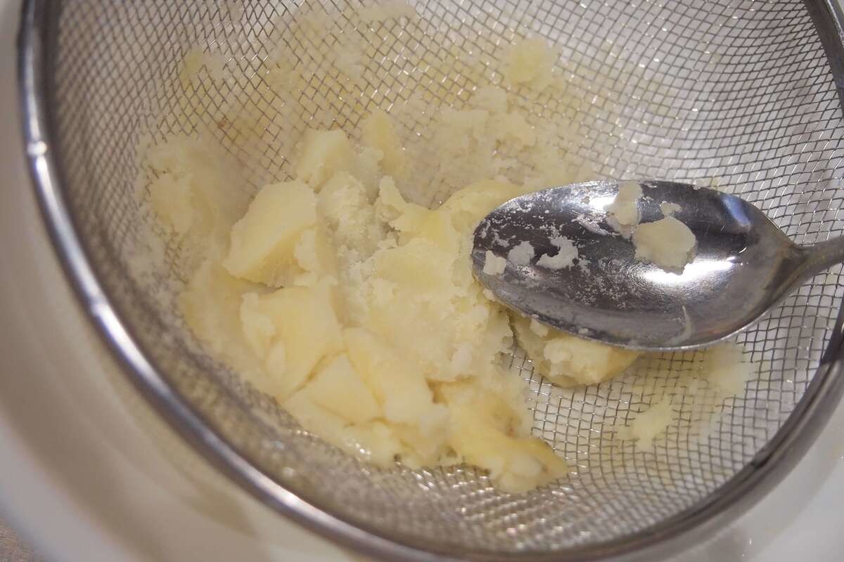 じゃがいもがやわらかくなったら、ザルなどを使って裏ごします。